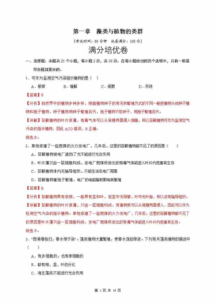 第1章 藻类与植物的类群(满分培优卷)(解析版)