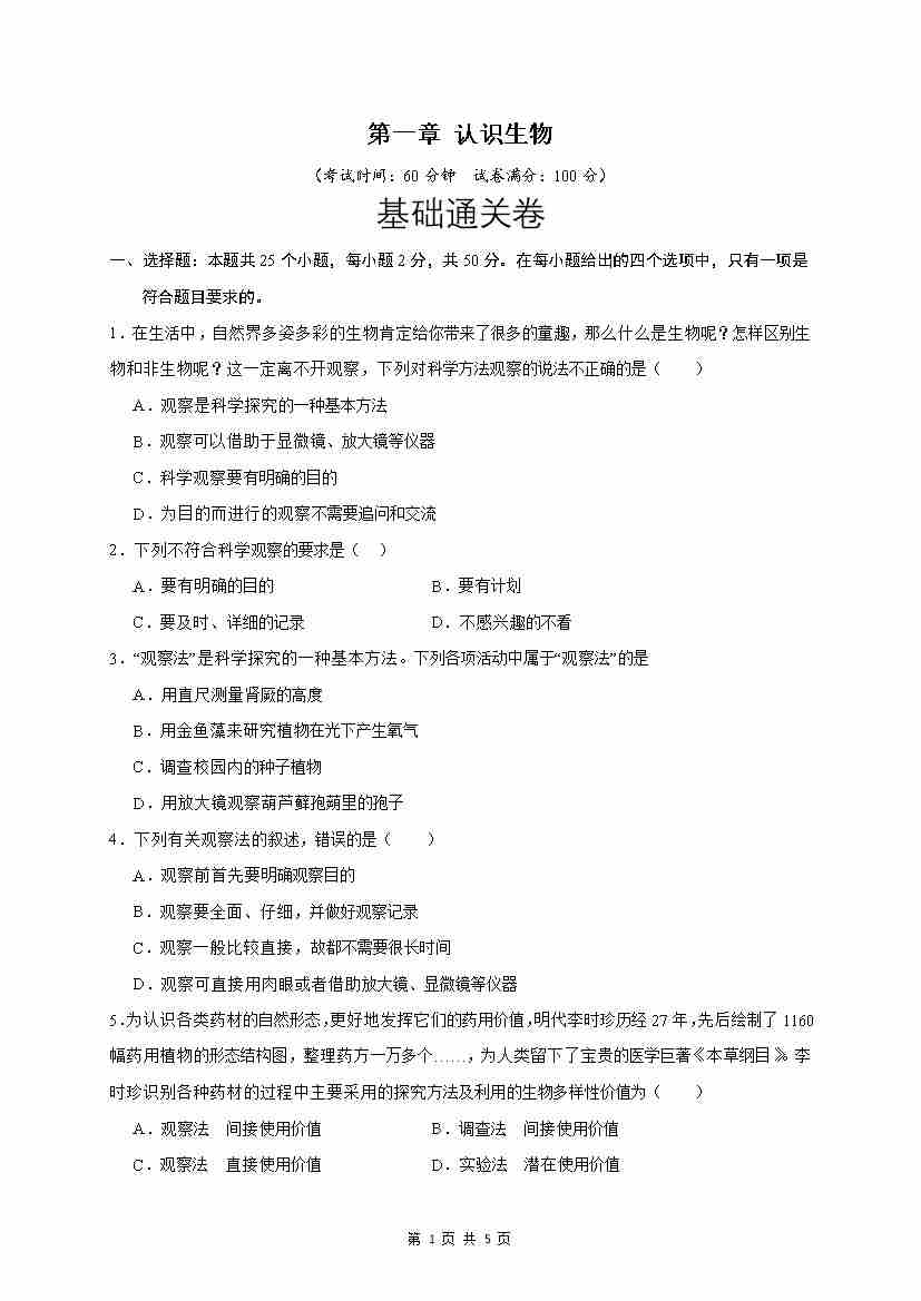 第1章 认识生物(基础通关卷)(原卷版)