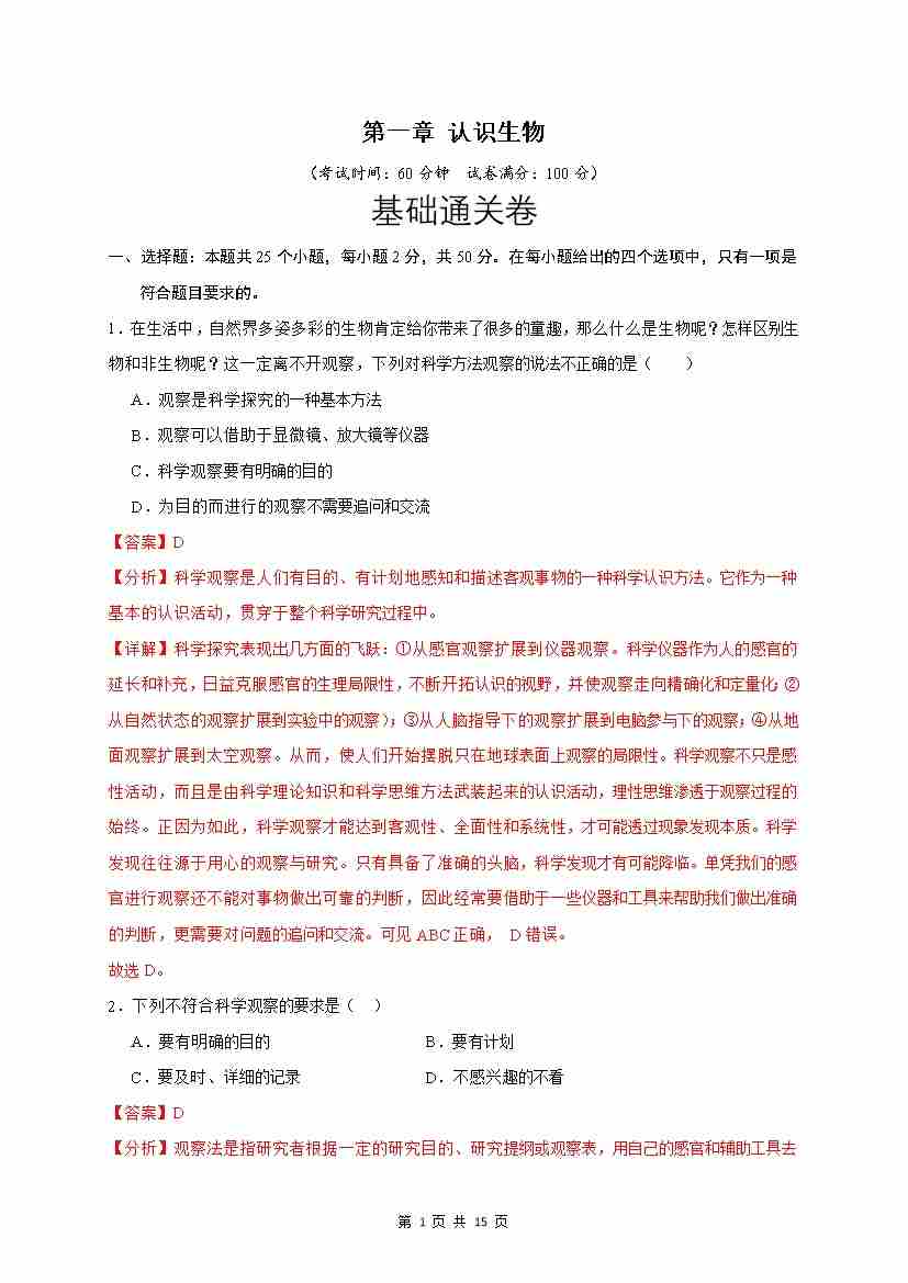 第1章 认识生物(基础通关卷)(解析版)
