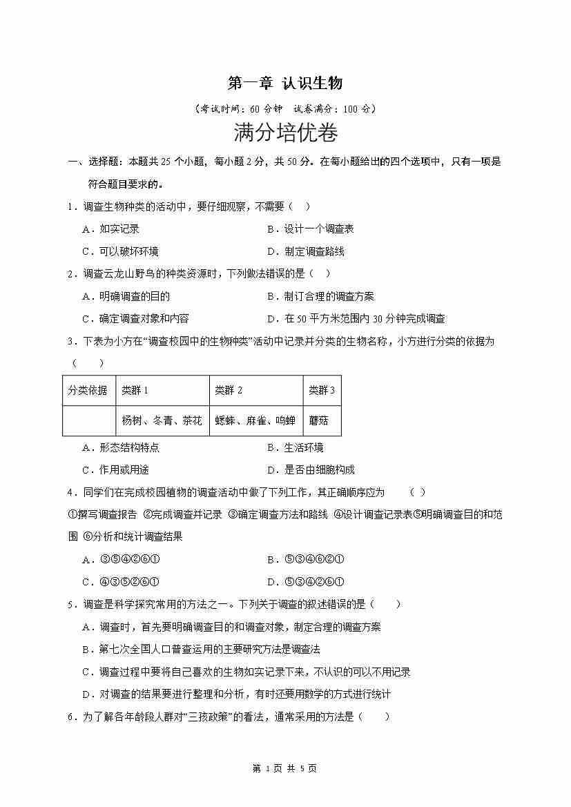 第1章 认识生物(满分培优卷)(原卷版)