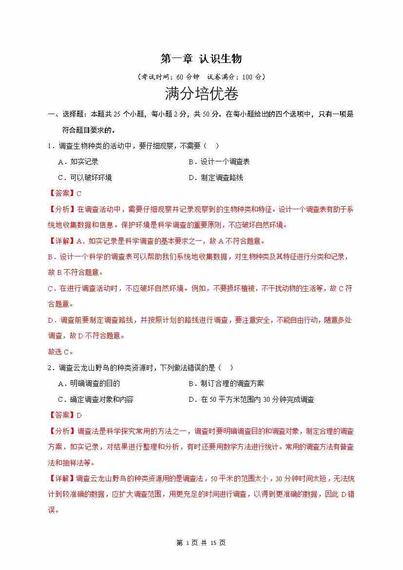 第1章 认识生物(满分培优卷)(解析版)
