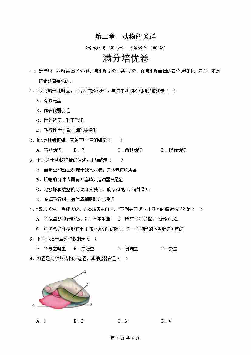 第2章 动物的类群(满分培优卷)(原卷版)