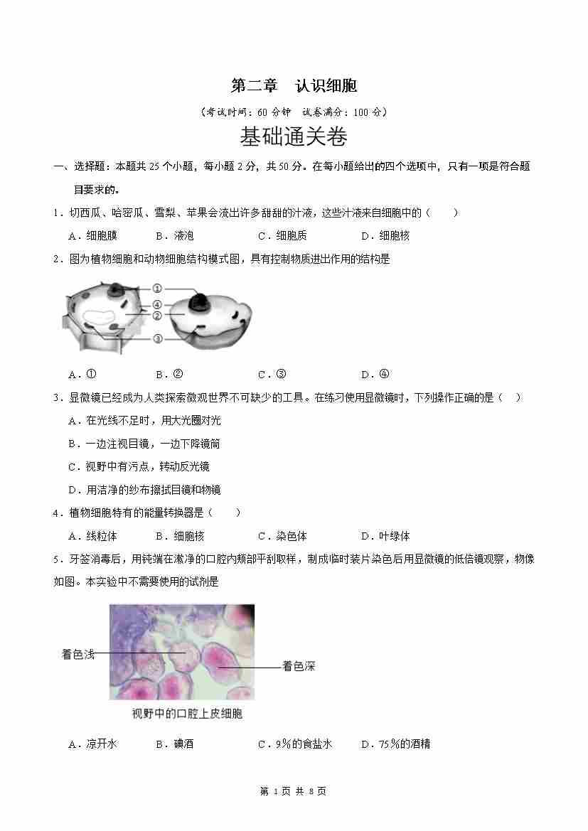 第2章 认识细胞(基础通关卷)(原卷版)
