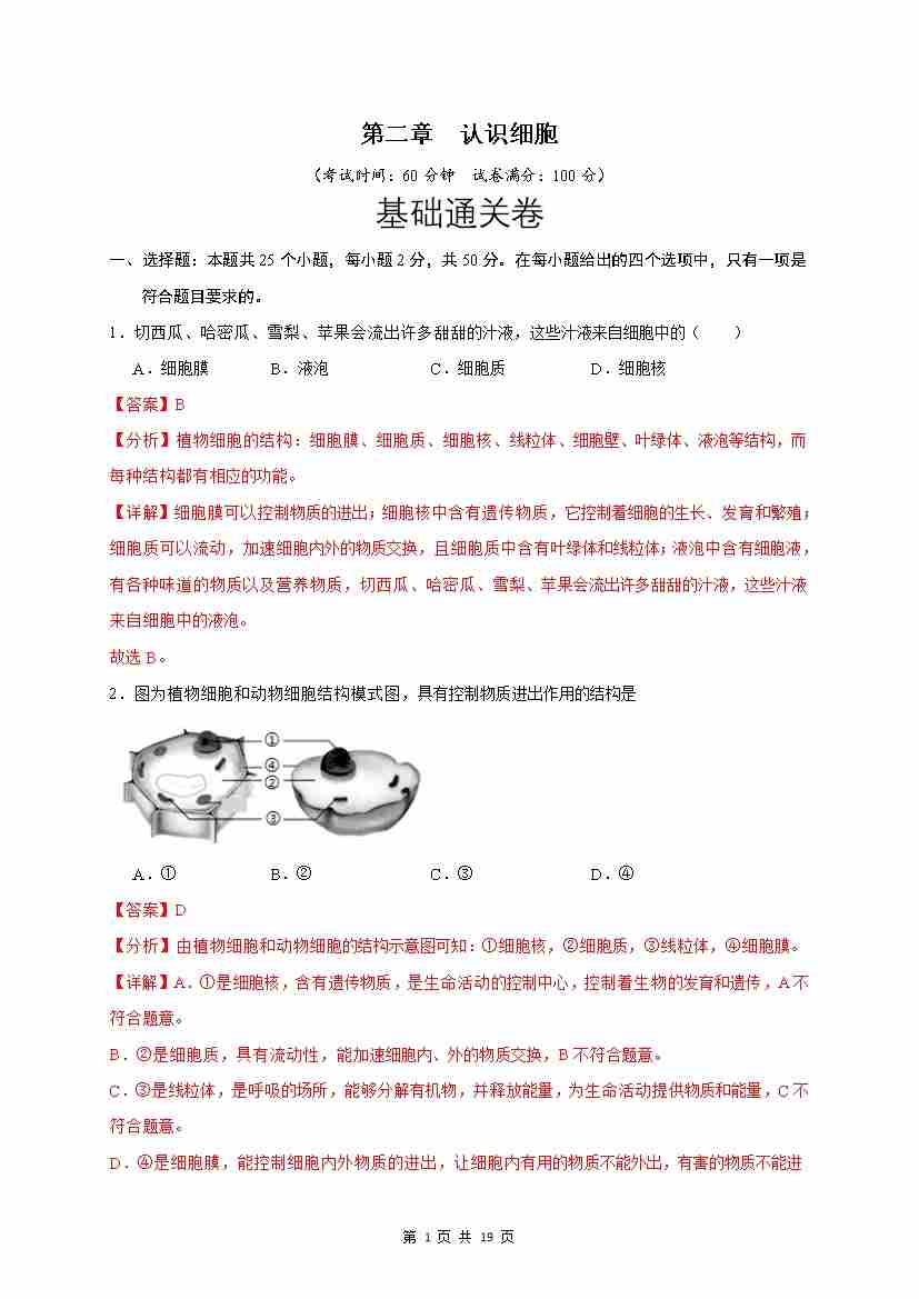 第2章 认识细胞(基础通关卷)(解析版)