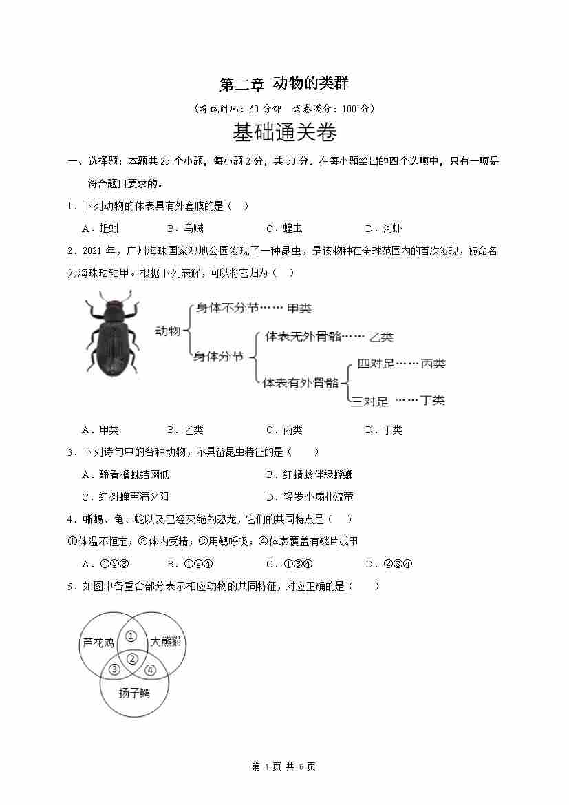 第2章 动物的类群(基础通关卷)(原卷版)