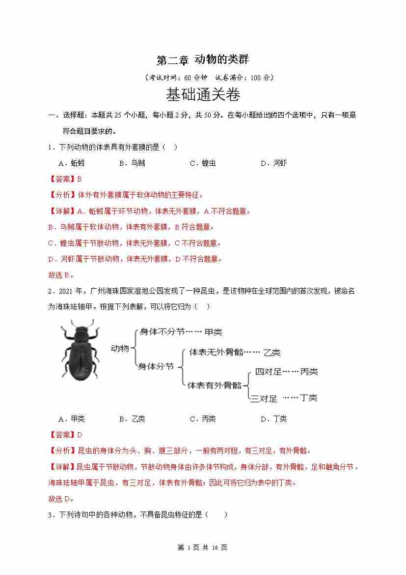 第2章 动物的类群(基础通关卷)(解析版)