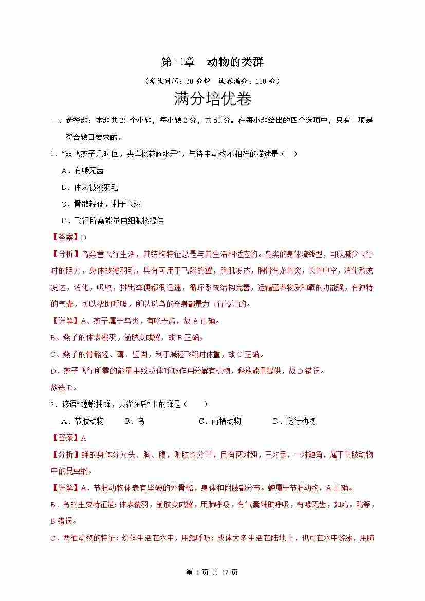 第2章 动物的类群(满分培优卷)(解析版)