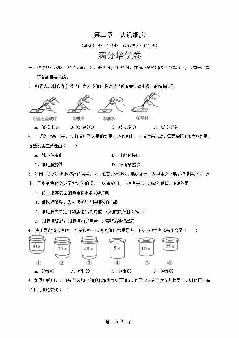 第2章 认识细胞(满分培优卷)(原卷版)