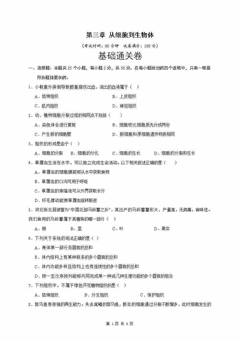 第3章 从细胞到生物体(基础通关卷)(原卷版)