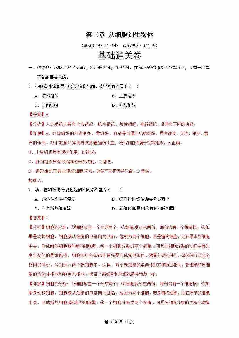 第3章 从细胞到生物体(基础通关卷)(解析版)