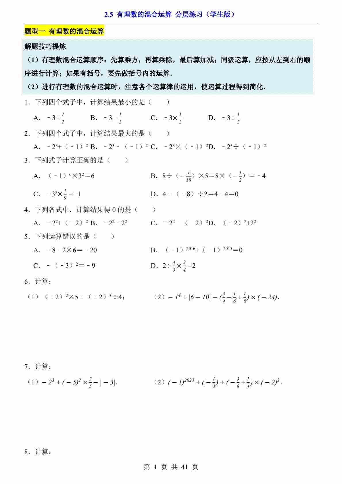 2.5 有理数的混合运算(分层练习)