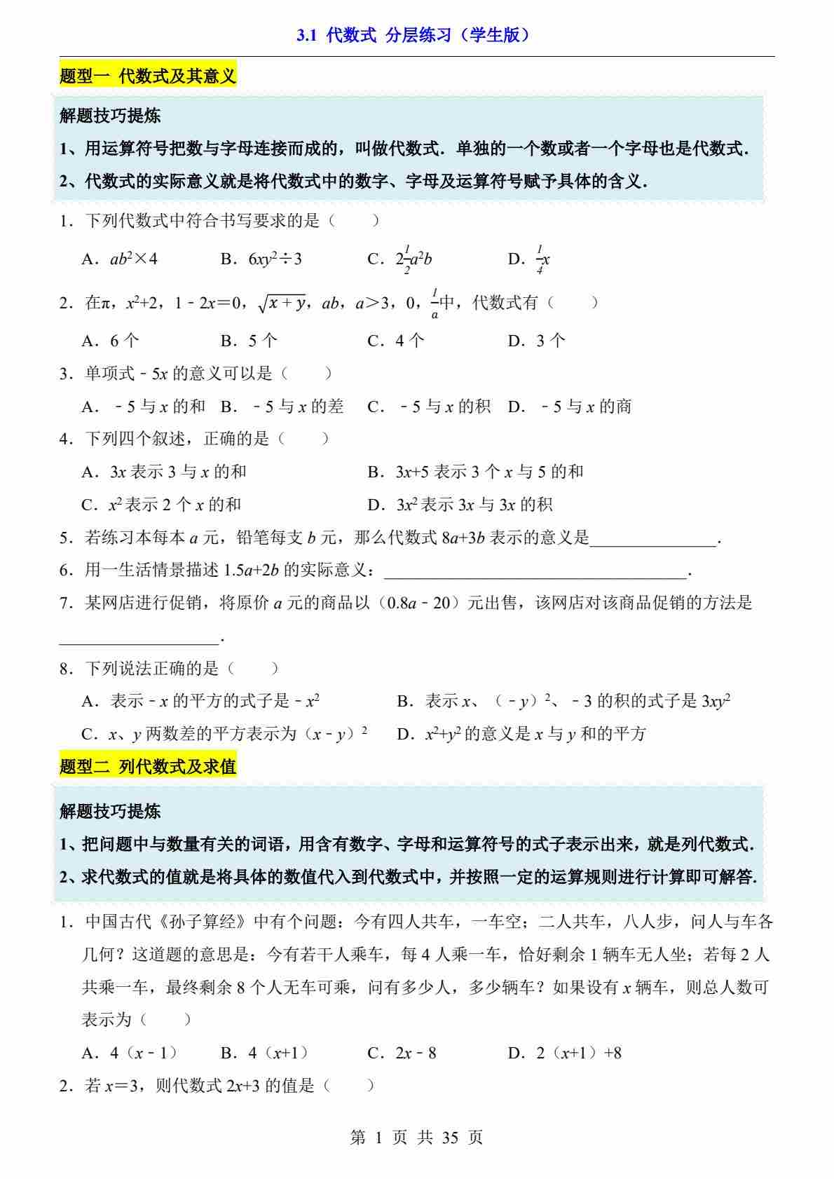 3.1 代数式(分层练习)