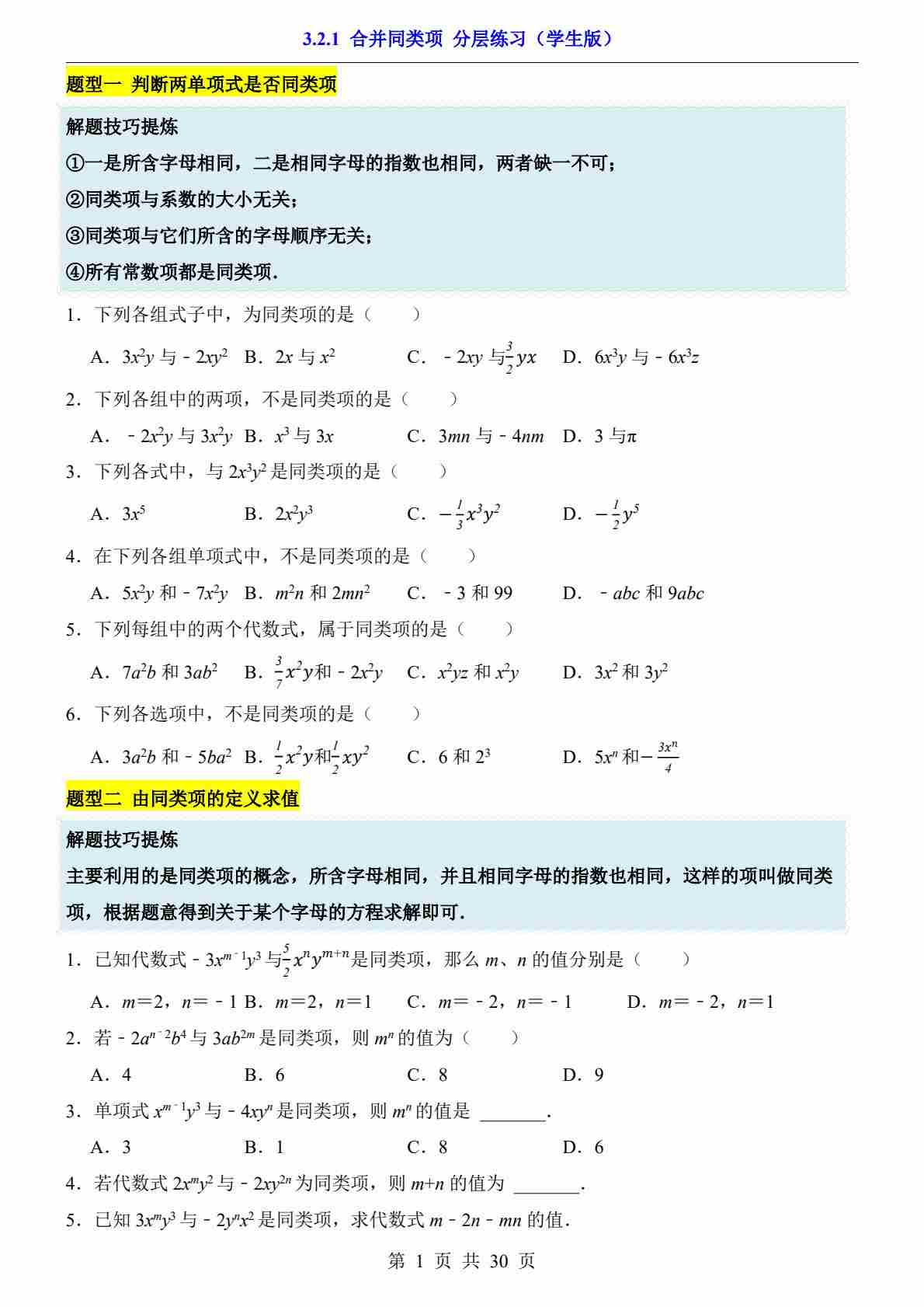 3.2.1 合并同类项(分层练习)