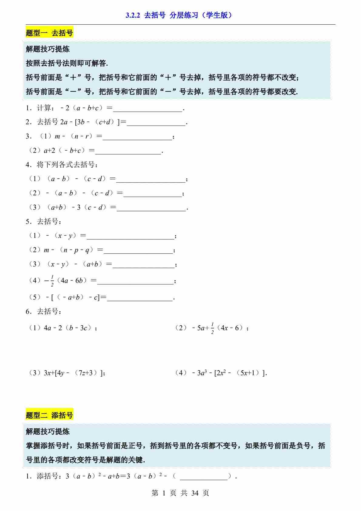 3.2.2 去括号(分层练习)