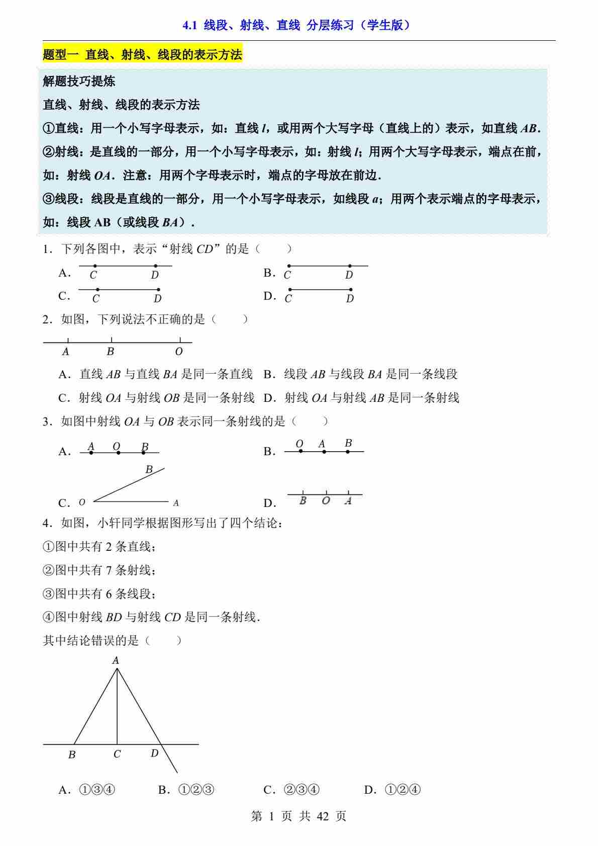 4.1 线段、射线、直线(分层练习)