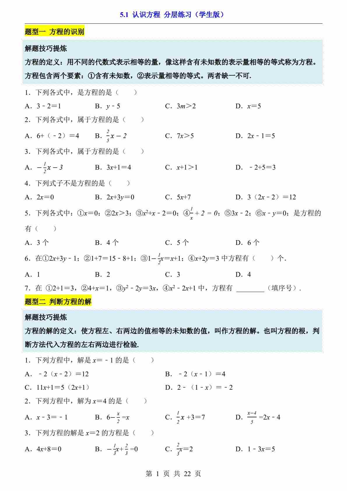 5.1 认识方程(分层练习)