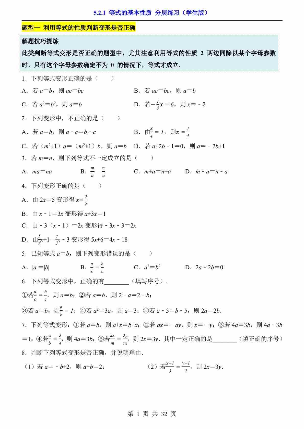 5.2.1 等式的基本性质(分层练习)