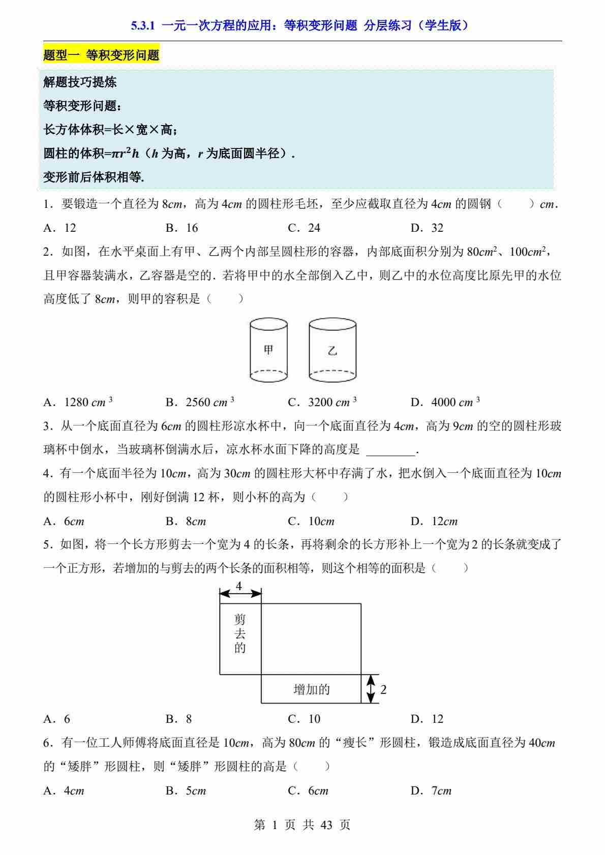 5.3.1 一元一次方程的应用:等积变形问题(分层练习)