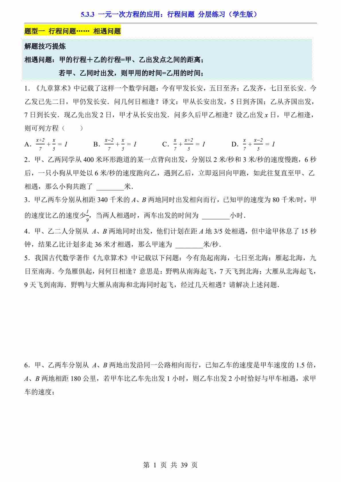 5.3.3 一元一次方程的应用:行程问题(分层练习)