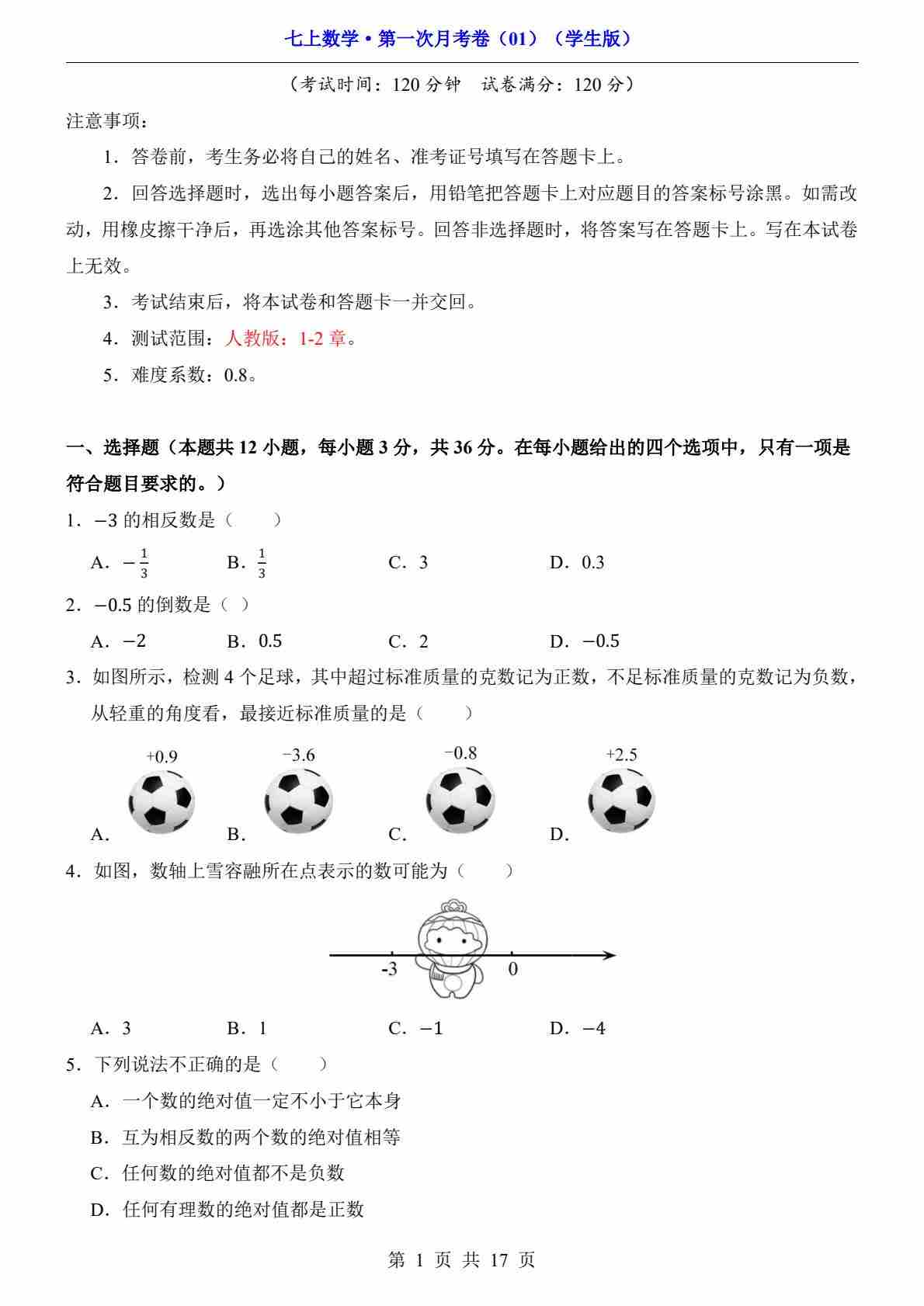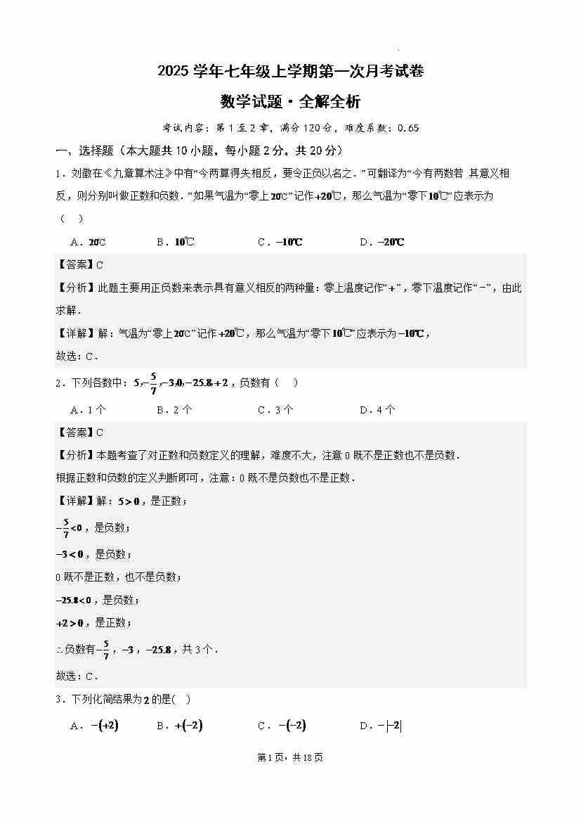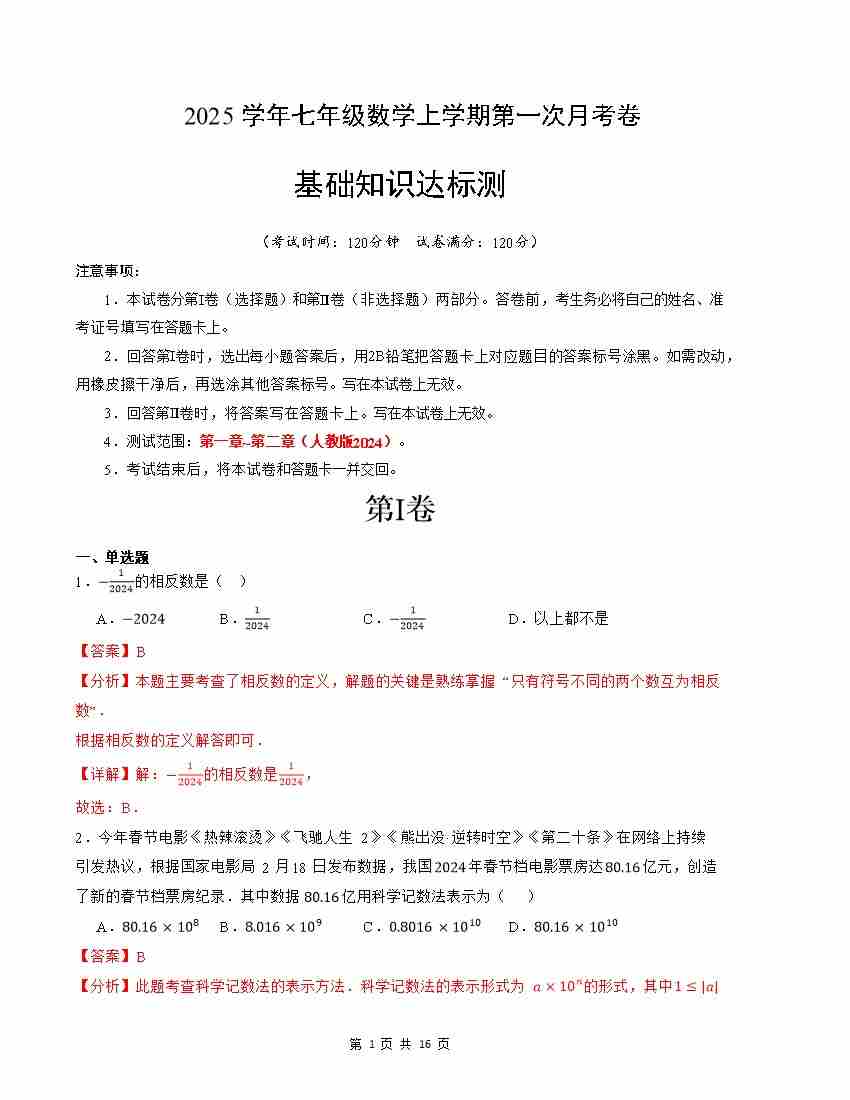 2025七上数学第一次月考卷(人教版2024)(全解全析)A4版