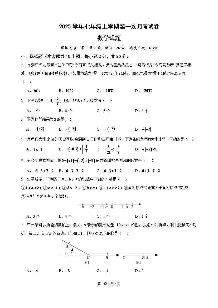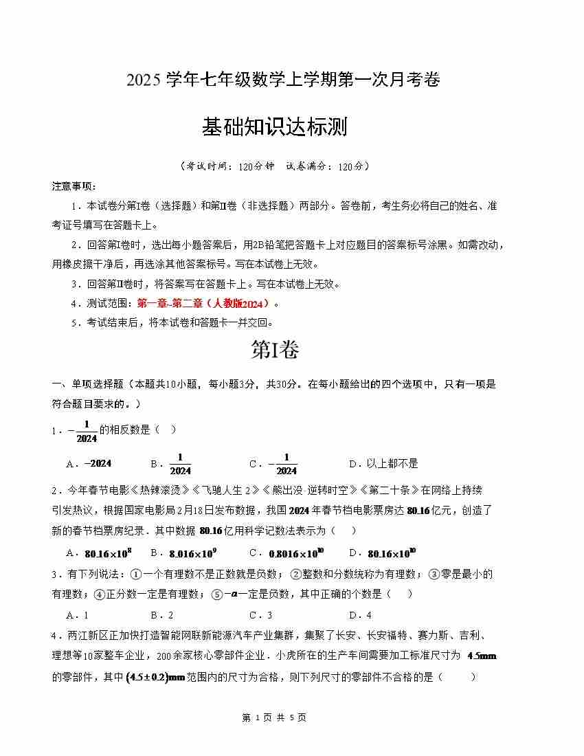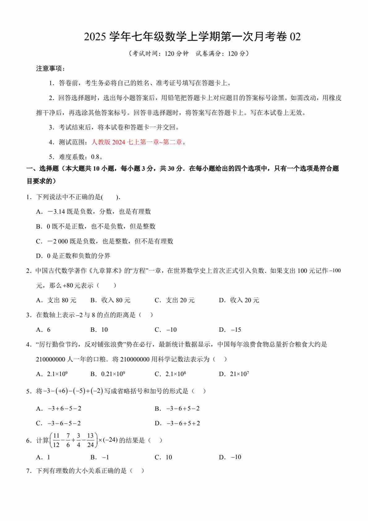 2025七上数学第一次月考卷02(人教版2024,七年级上上册第一章~第二章).