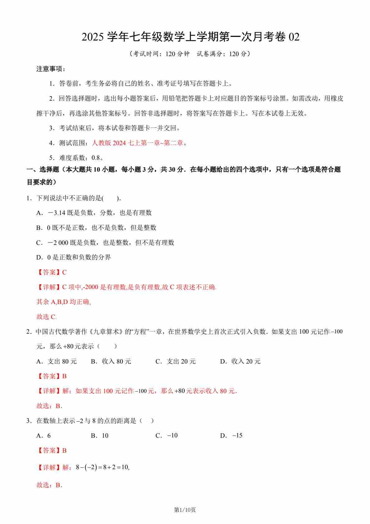 2025七上数学第一次月考卷02(人教版2024,七年级上上册第一章~第二章)(全解全析)..