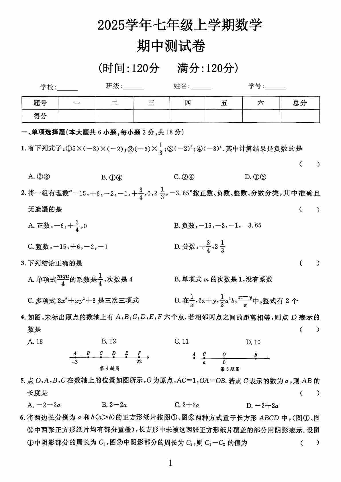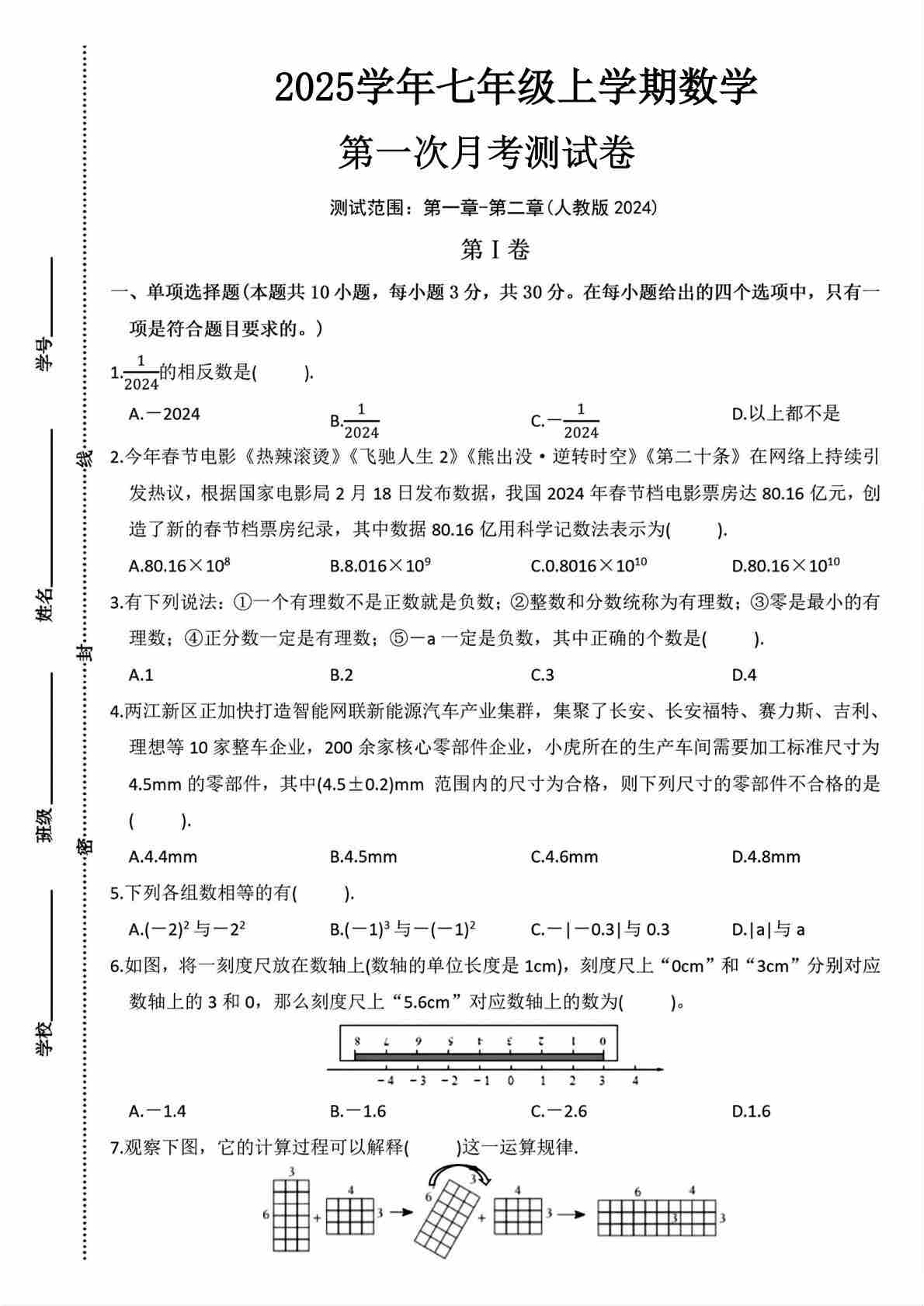 2025七上数学第一次月考卷(人教版2024)(考试版)【测试范围:第一、二章】A4版