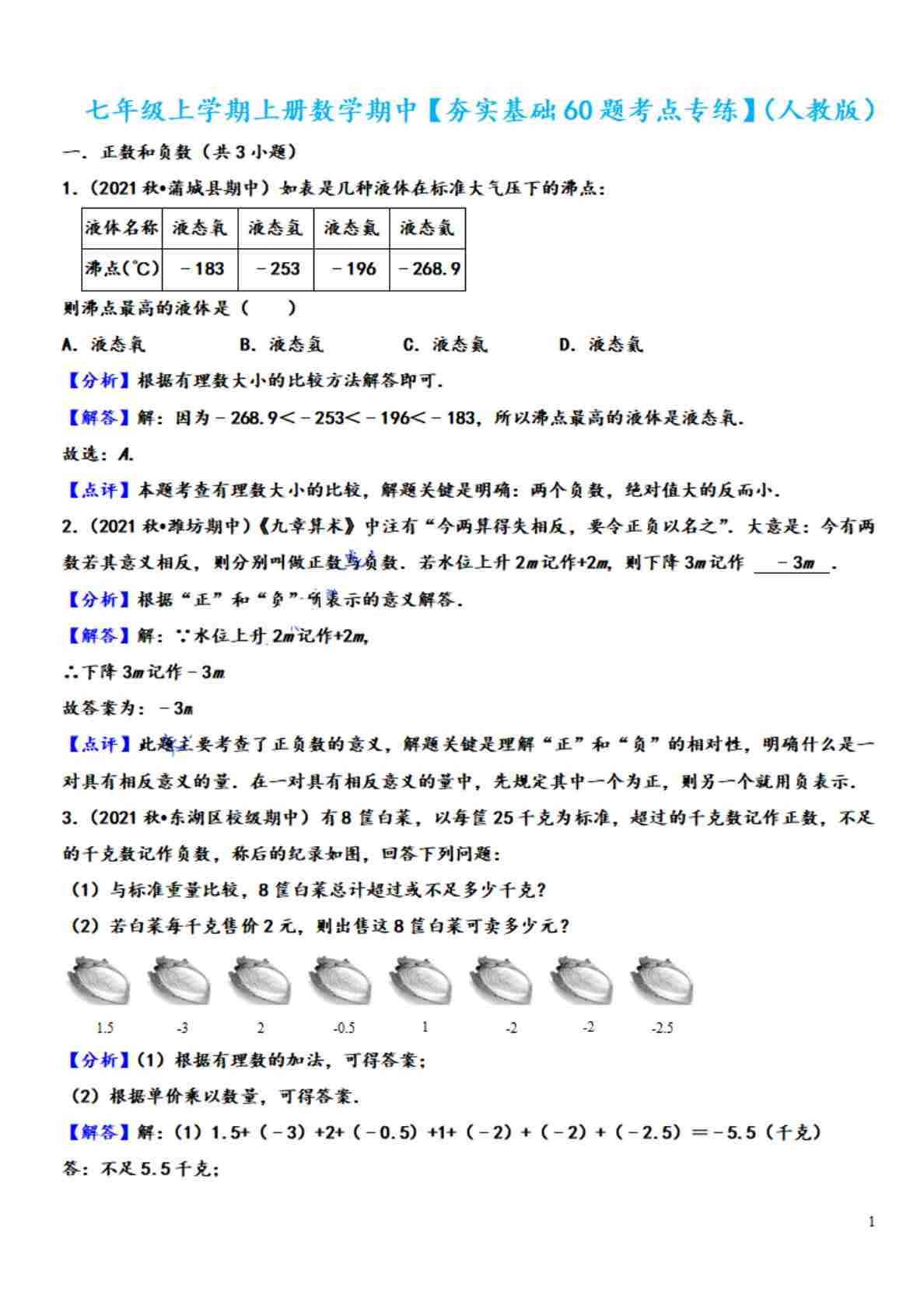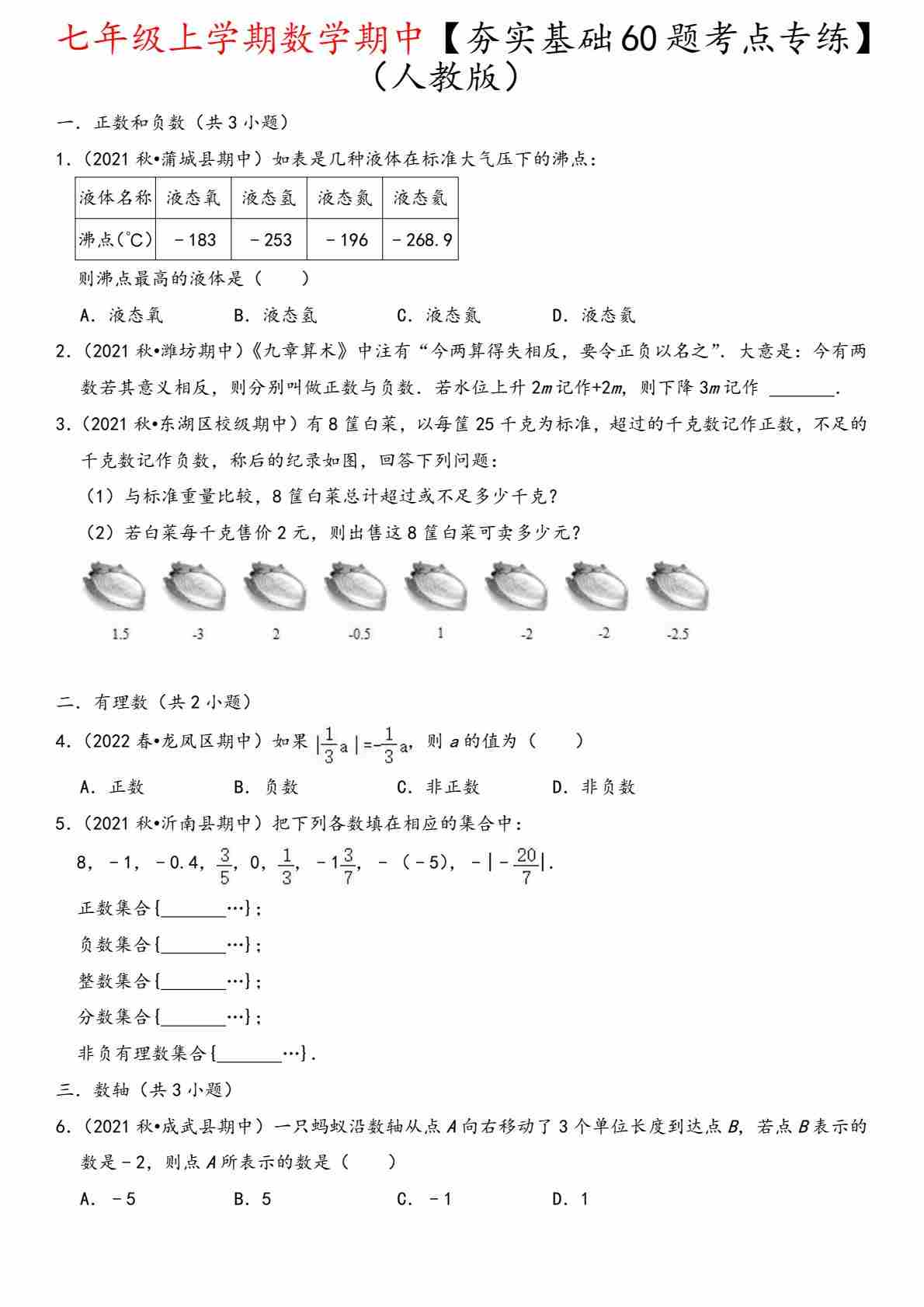 七年级数学上学期期中【夯实基础60题考点专练】(解析版)(人教版)