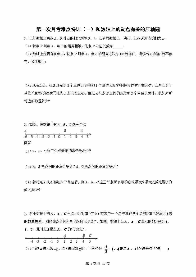 第一次月考难点特训(1)和数轴上的动点有关的压轴题(原卷版)