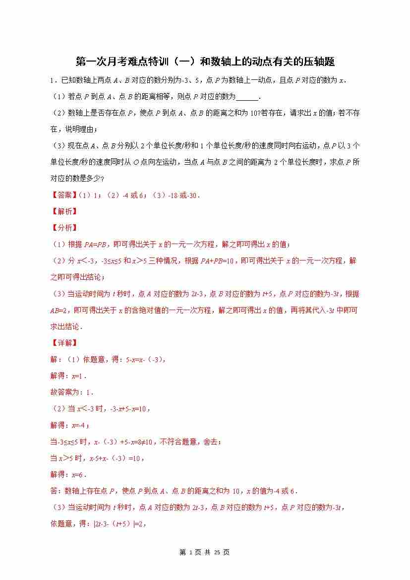 第一次月考难点特训(1)和数轴上的动点有关的压轴题(解析版)