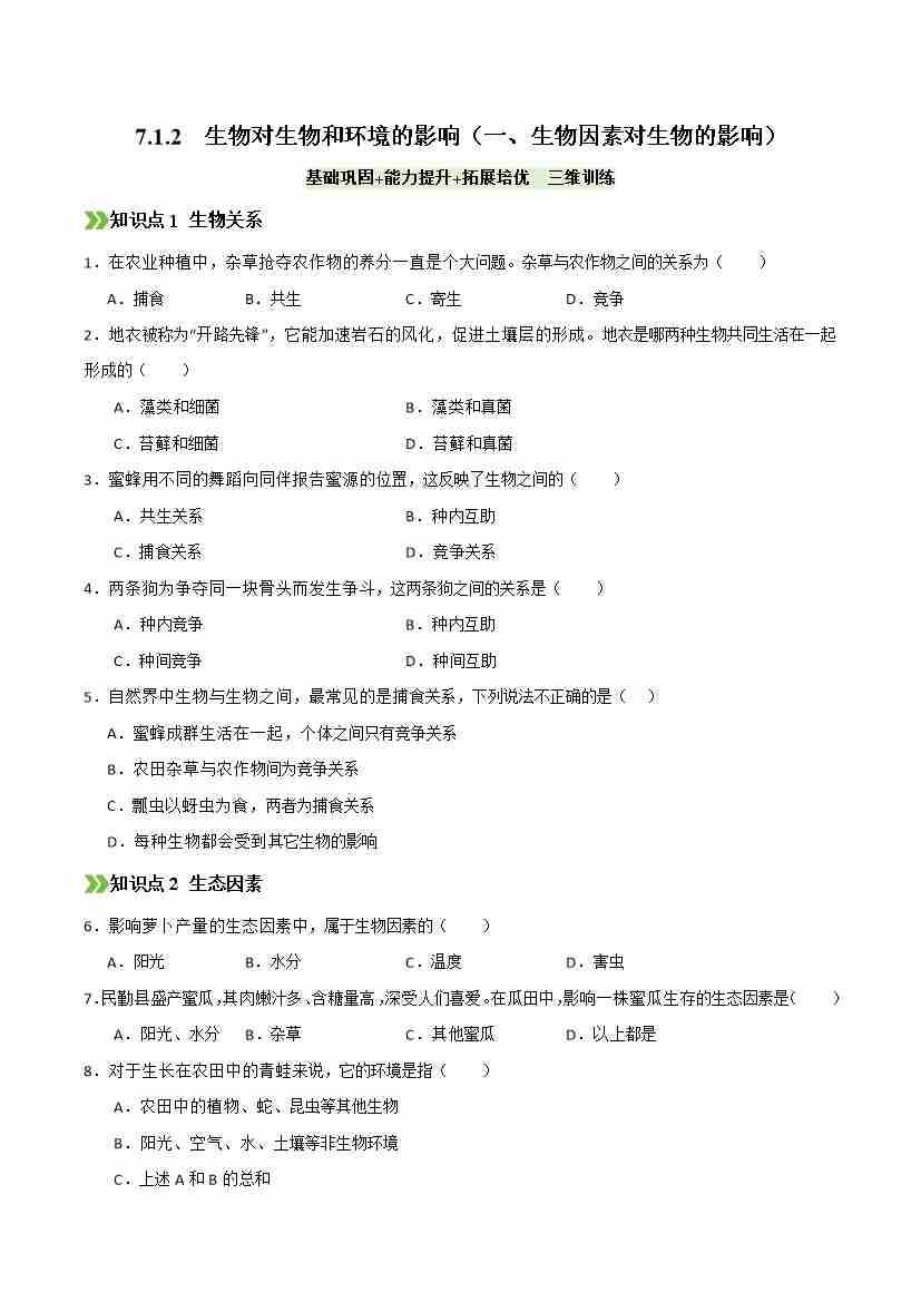 7.1.2 生物对生物和环境的影响(一、生物因素对生物的影响)(分层作业)(原卷版)