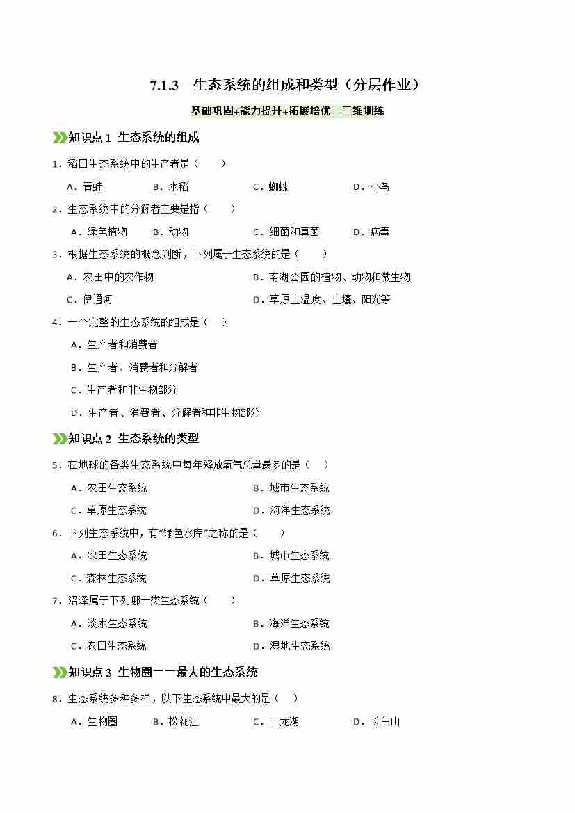 7.1.3 生态系统的组成和类型(分层作业)(原卷版)