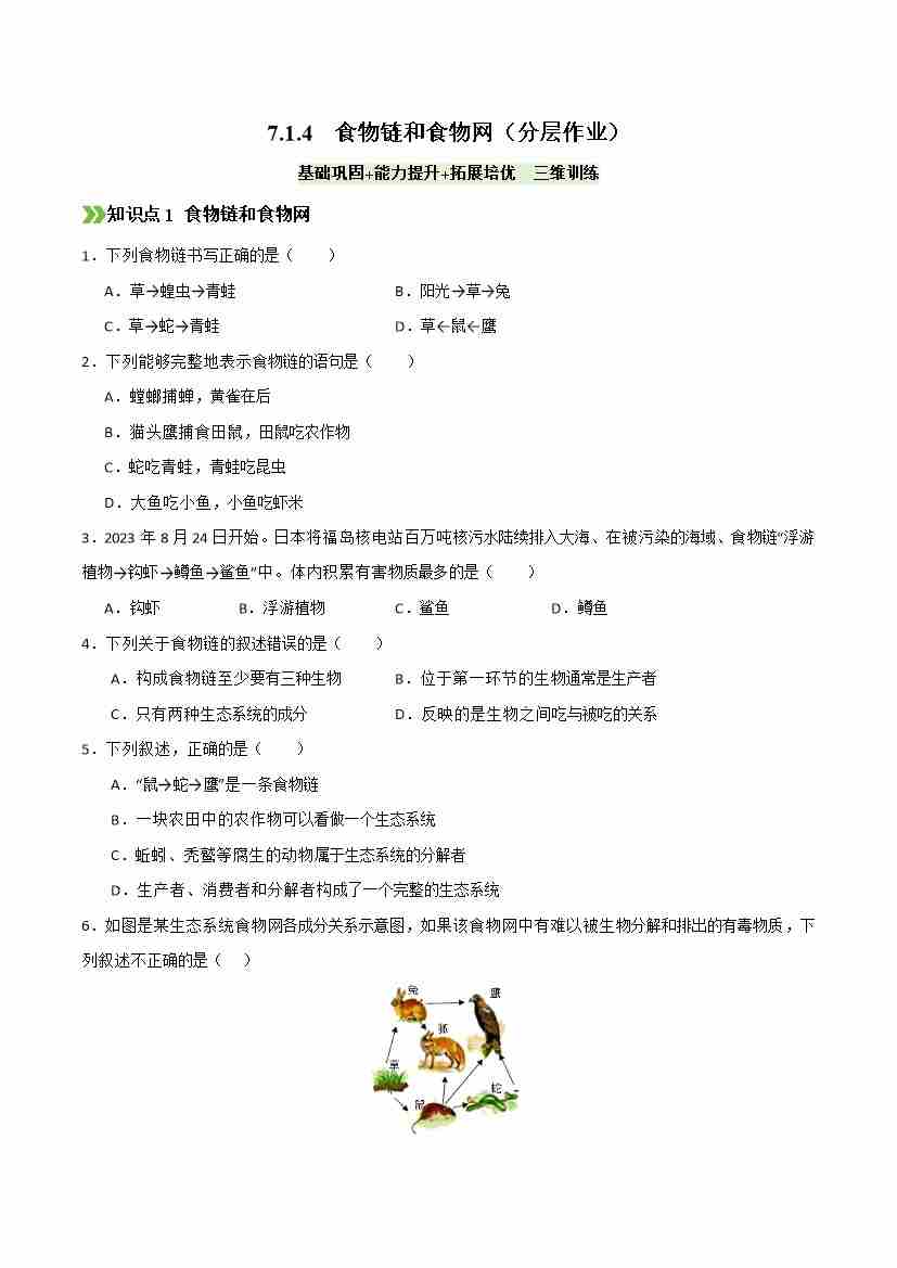 7.1.4 食物链和食物网(分层作业)(原卷版)
