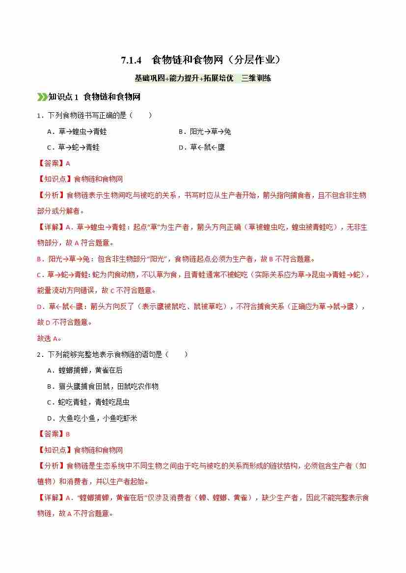 7.1.4 食物链和食物网(分层作业)(解析版)