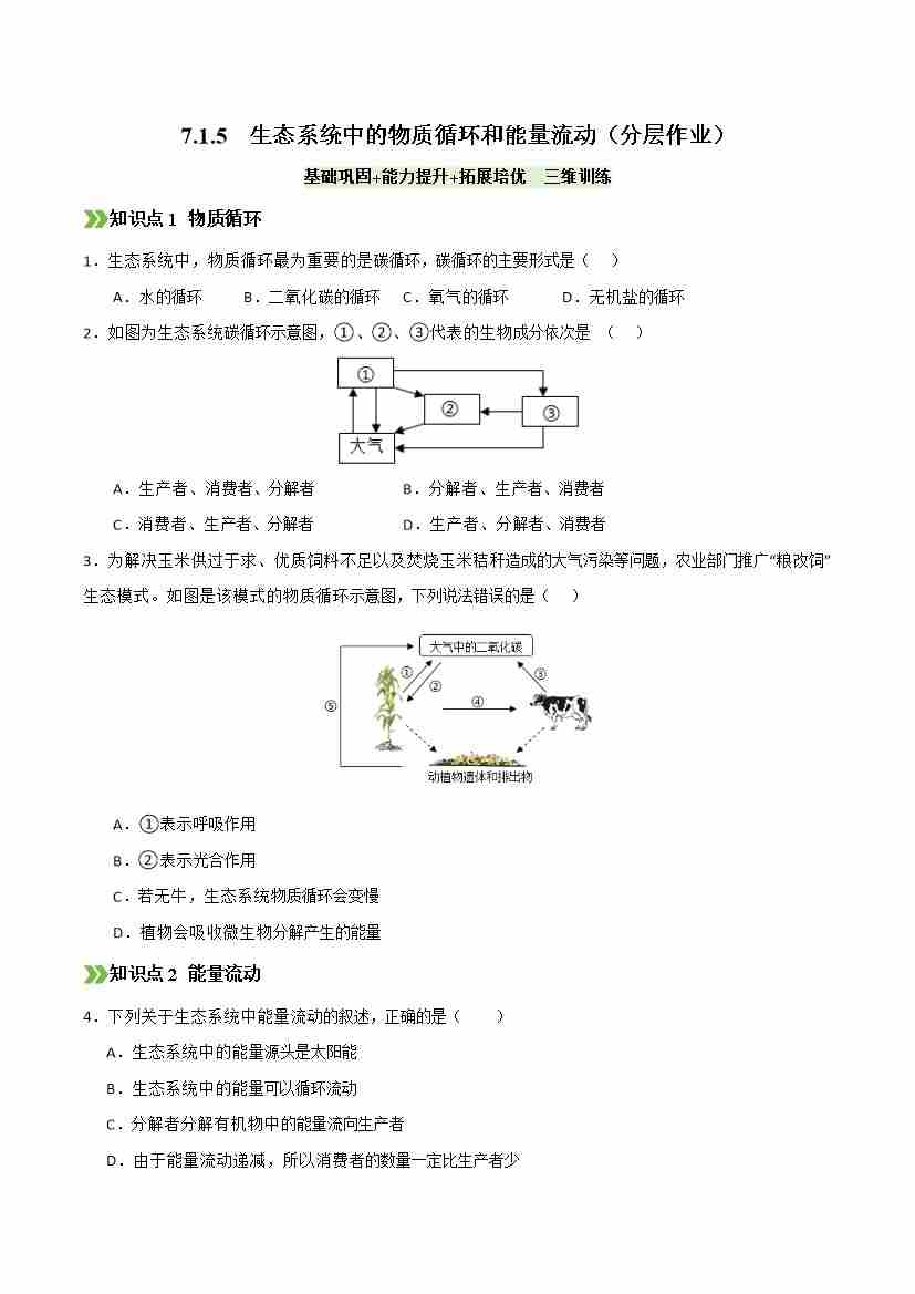 7.1.5 生态系统中的物质循环和能量流动(分层作业)(原卷版)