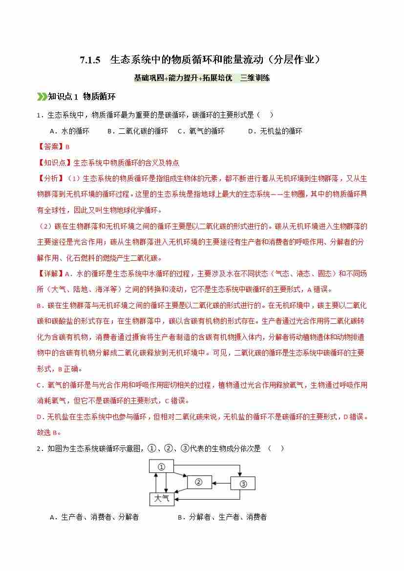7.1.5 生态系统中的物质循环和能量流动(分层作业)(解析版)