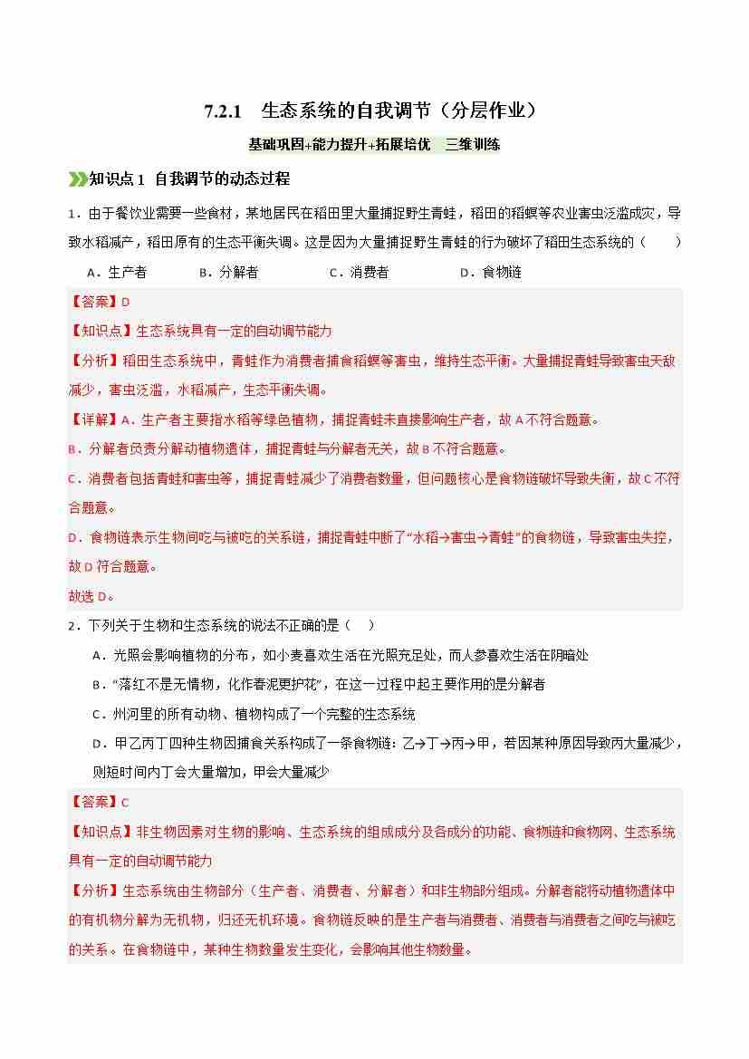 7.2.1 生态系统的自我调节(分层作业)(解析版)