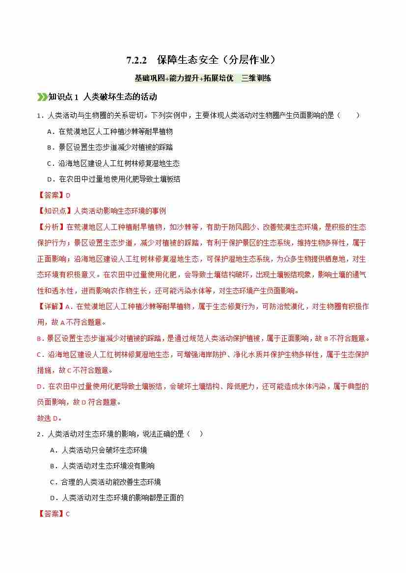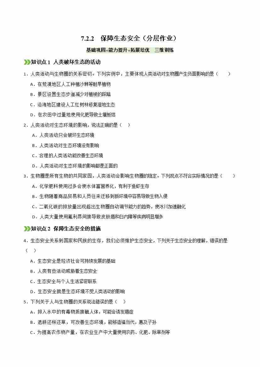 7.2.2 保障生态安全(分层作业)(原卷版)