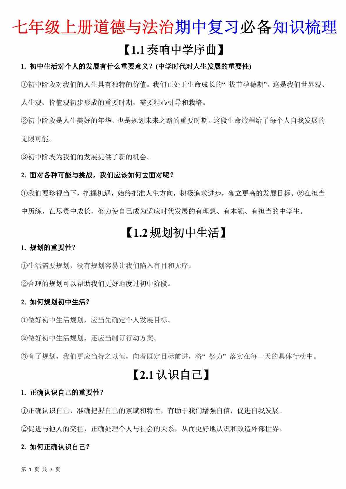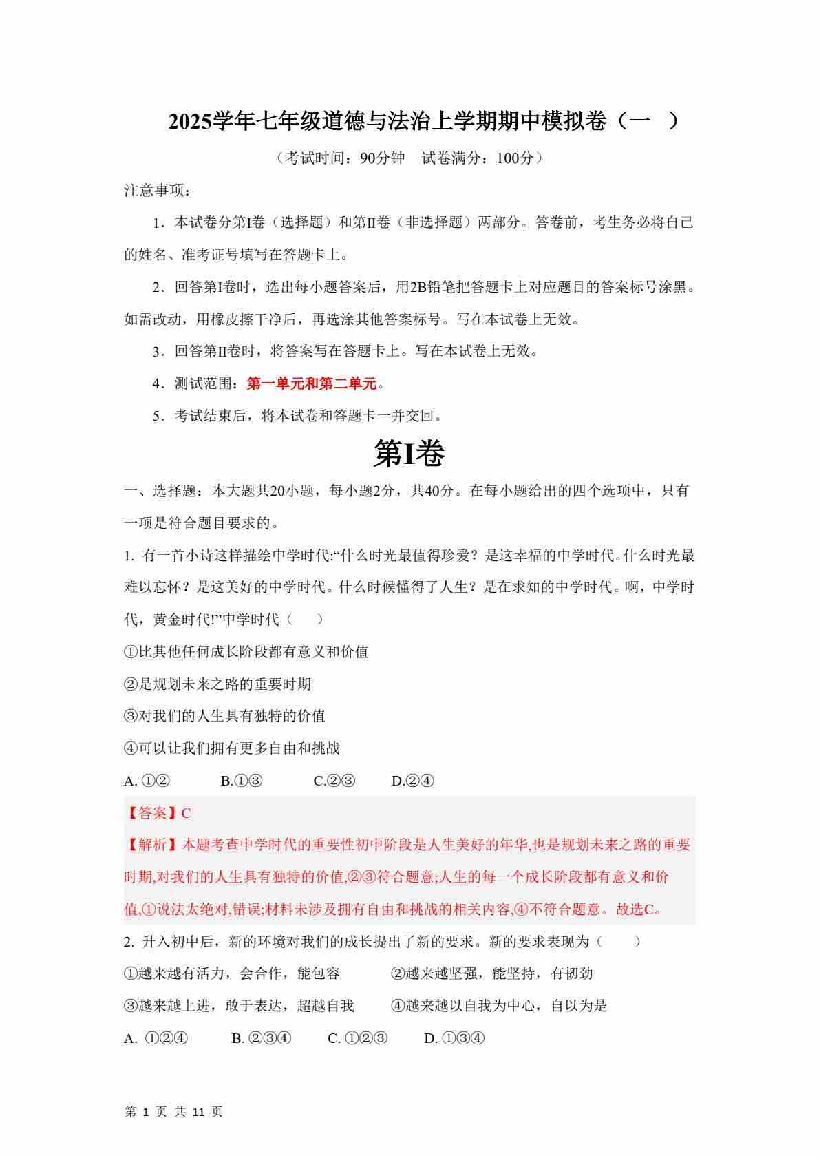 2024-2025学年七年级道德与法治上学期期中模拟卷(1) (解析版)