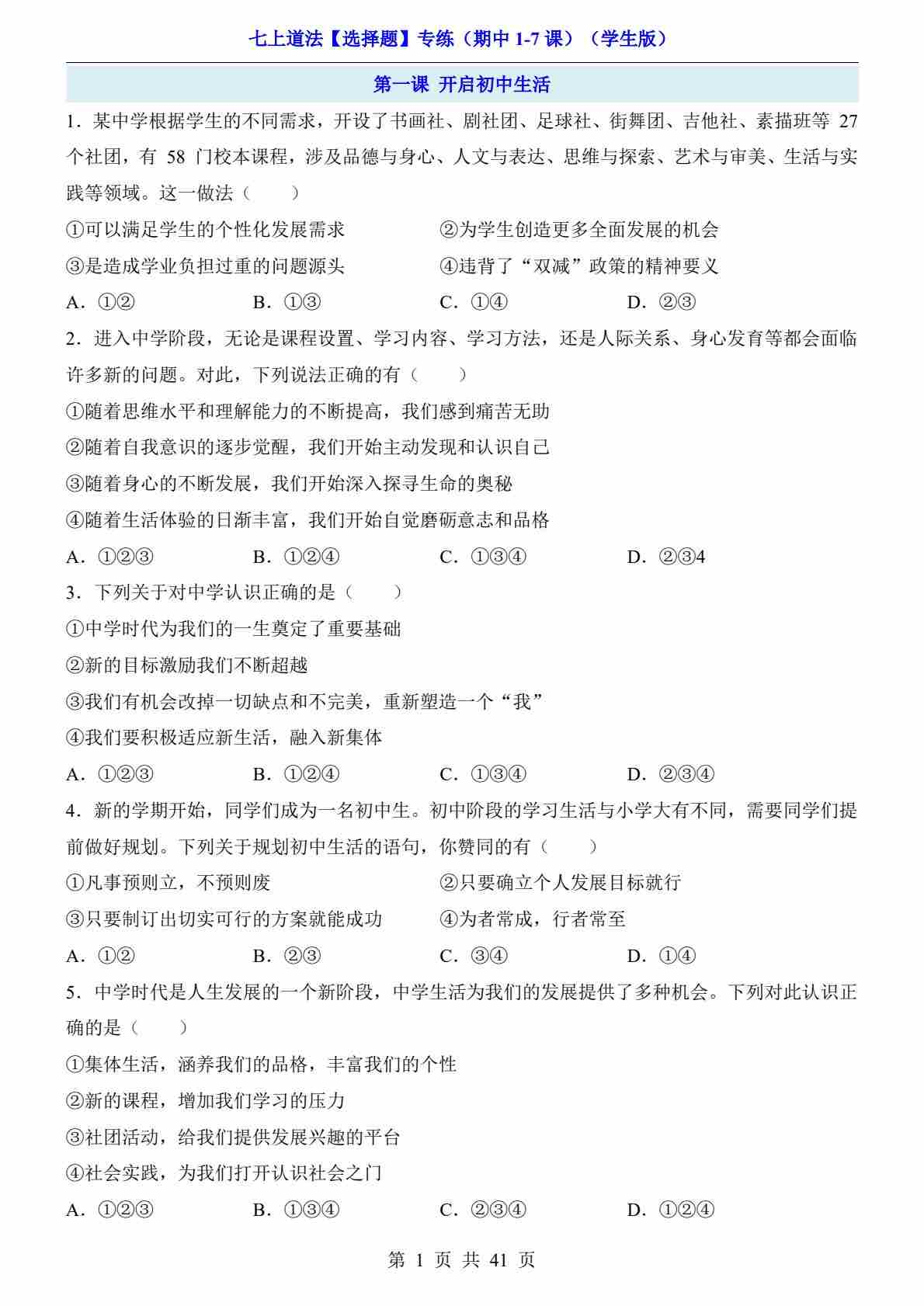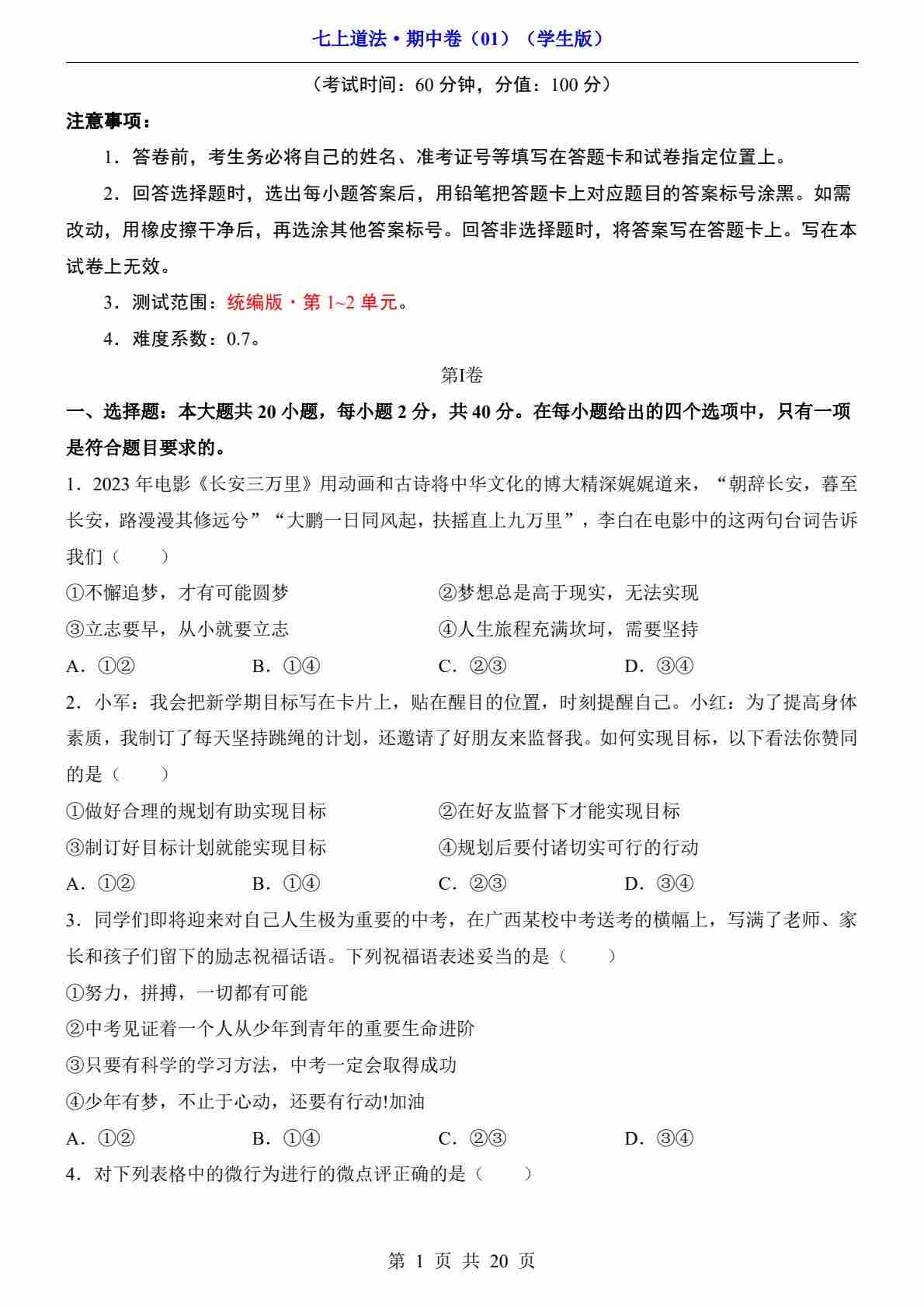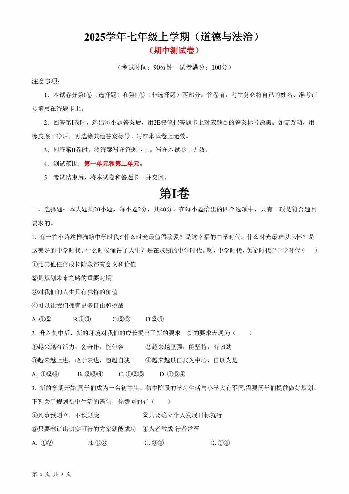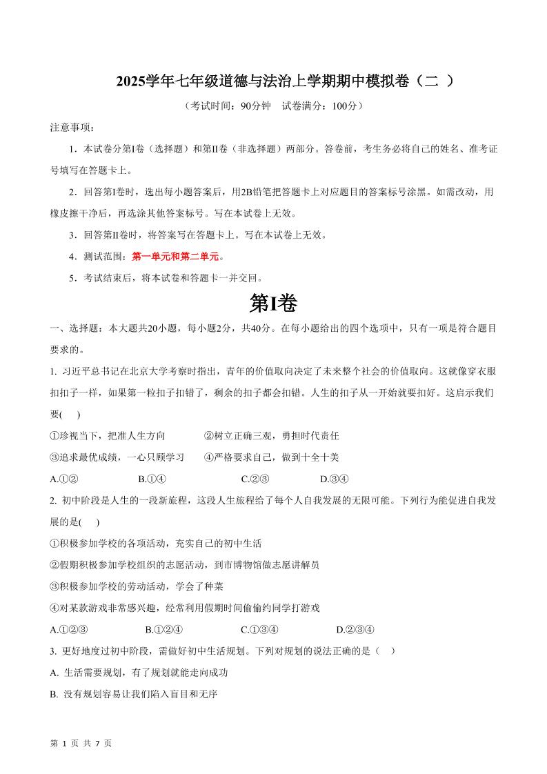 2024-2025学年七年级道德与法治上学期期中模拟卷(1)(原卷版)