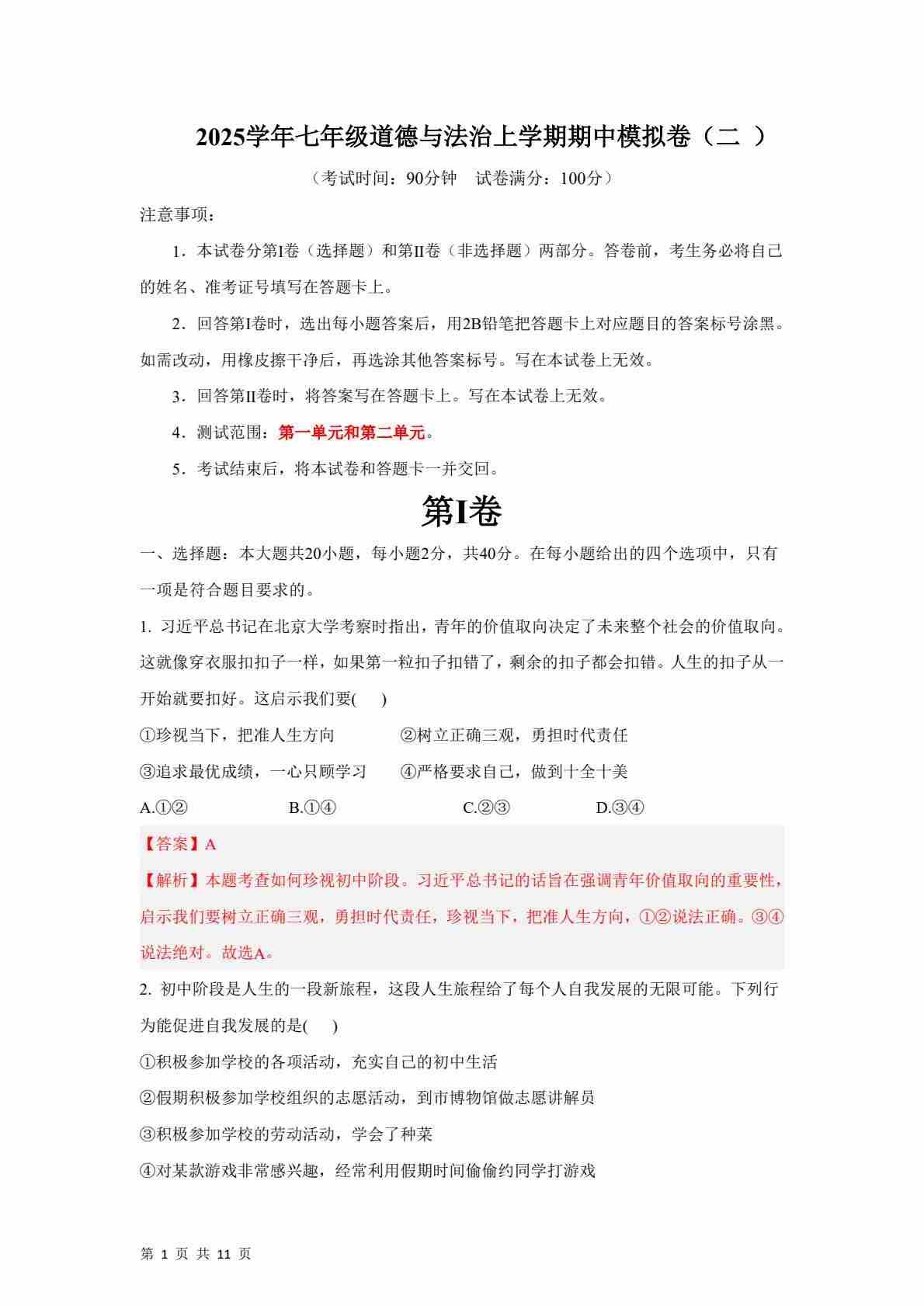 2024-2025学年七年级道德与法治上学期期中模拟卷(2)(解析版)