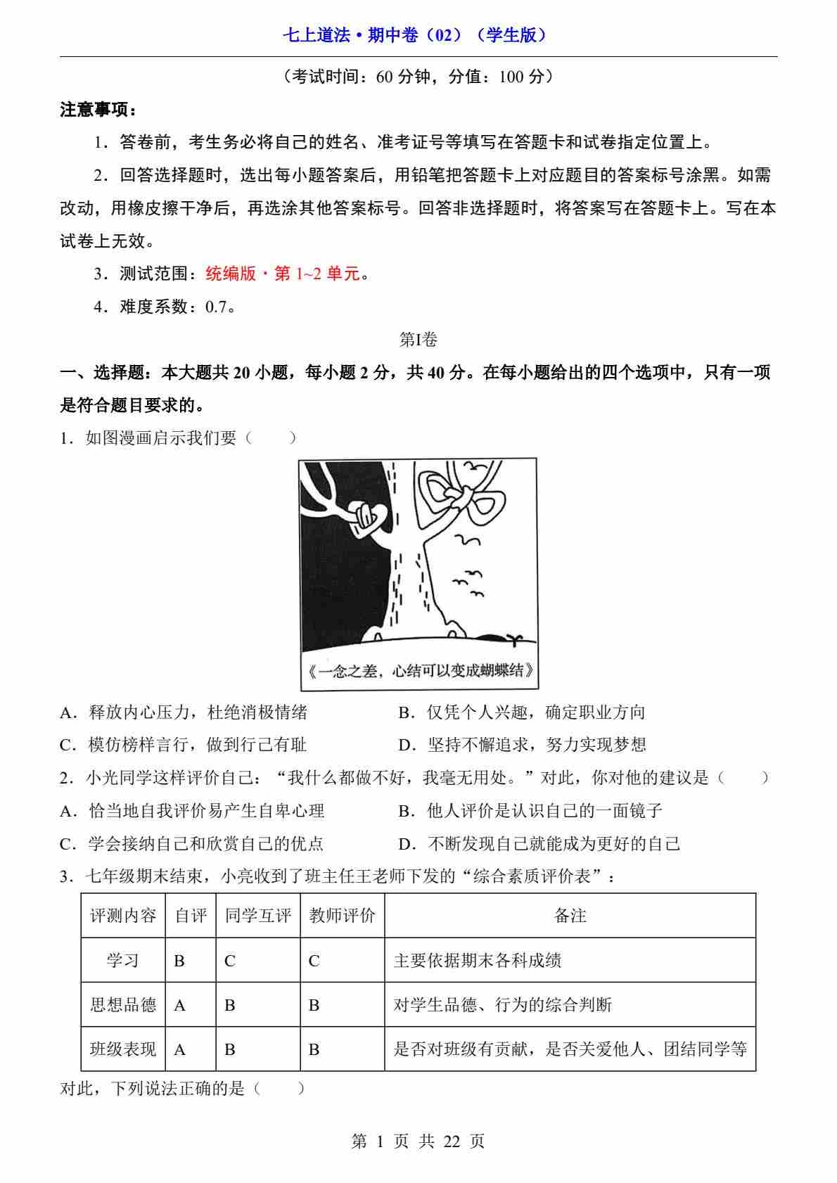 2024-2025学年七年级道德与法治上学期期中模拟卷(2)(原卷版)3