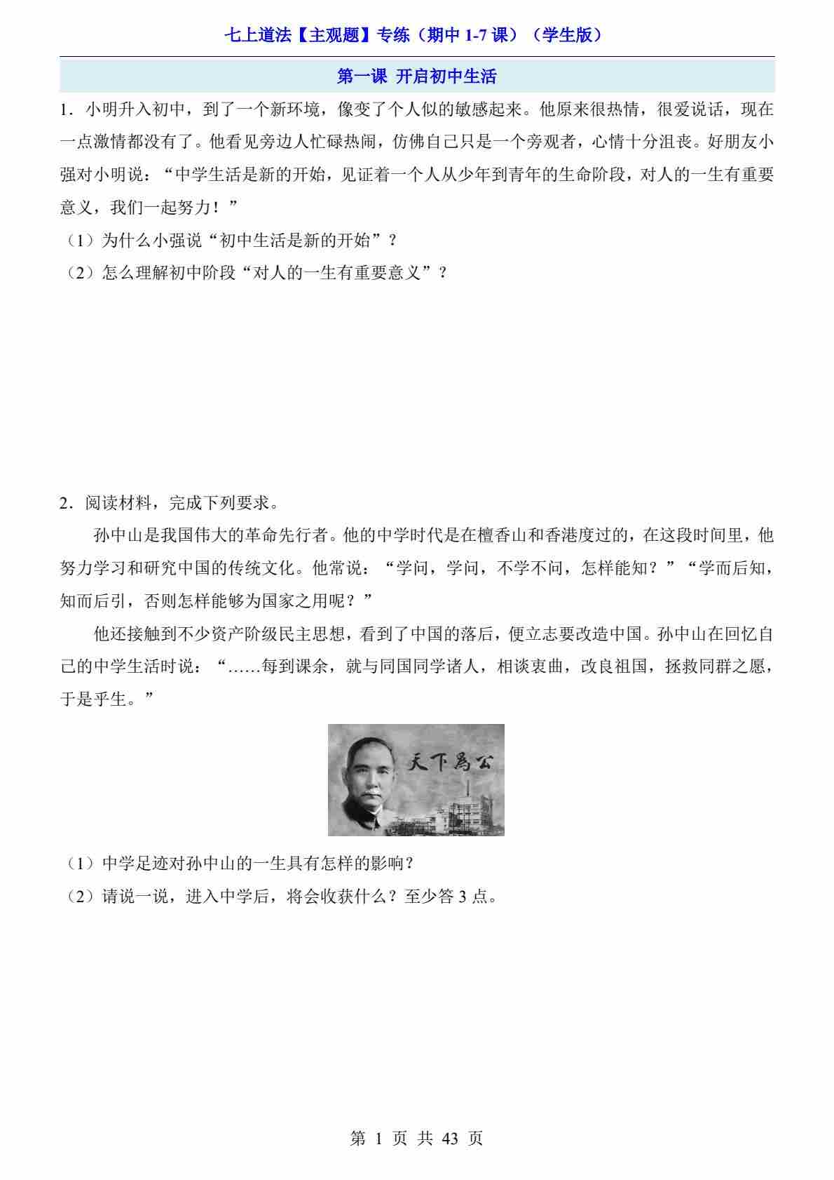 七年级道德与法治期中复习—必刷主观题(36题)(原卷版)