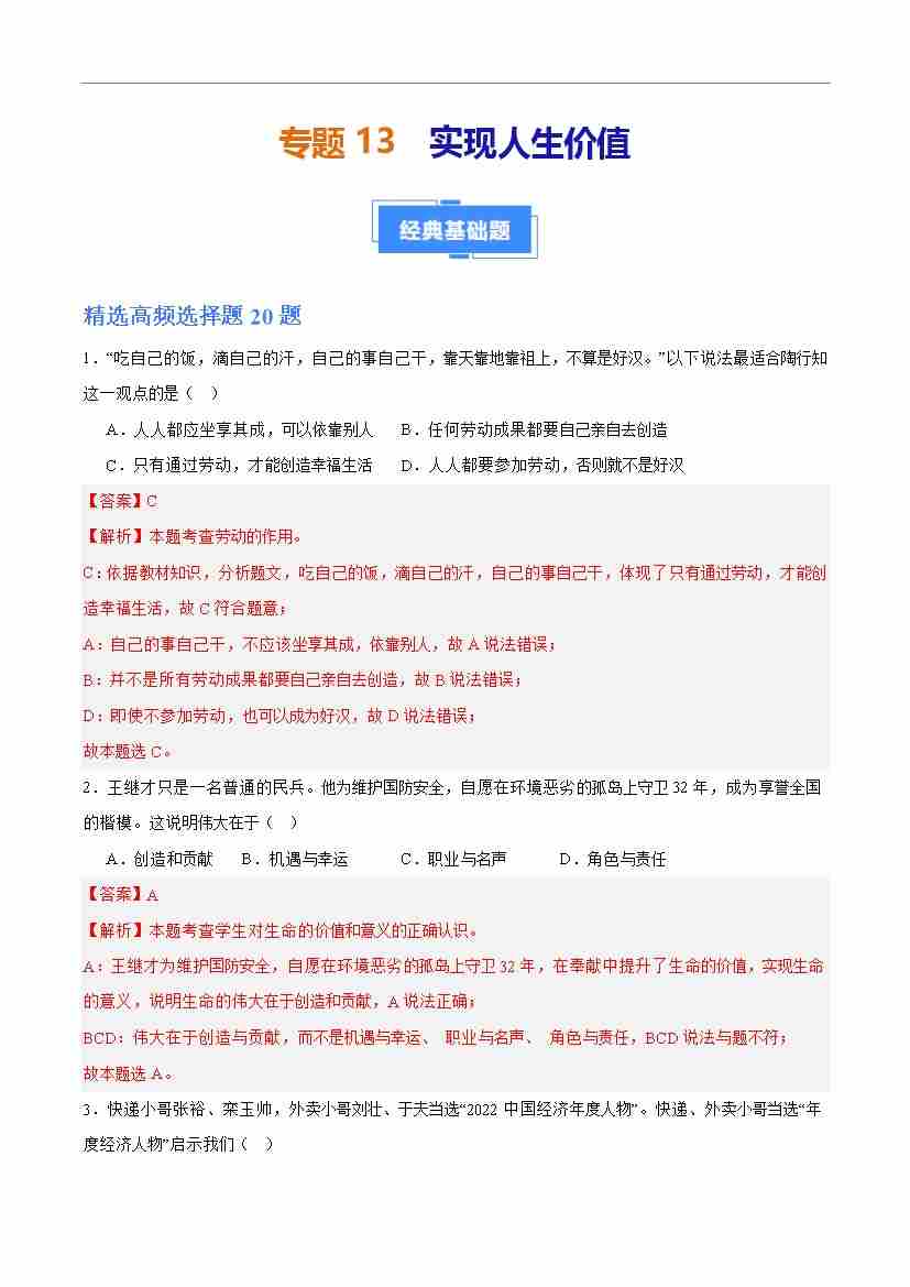 专题13 实现人生价值(高频非选择题20题)(解析版)
