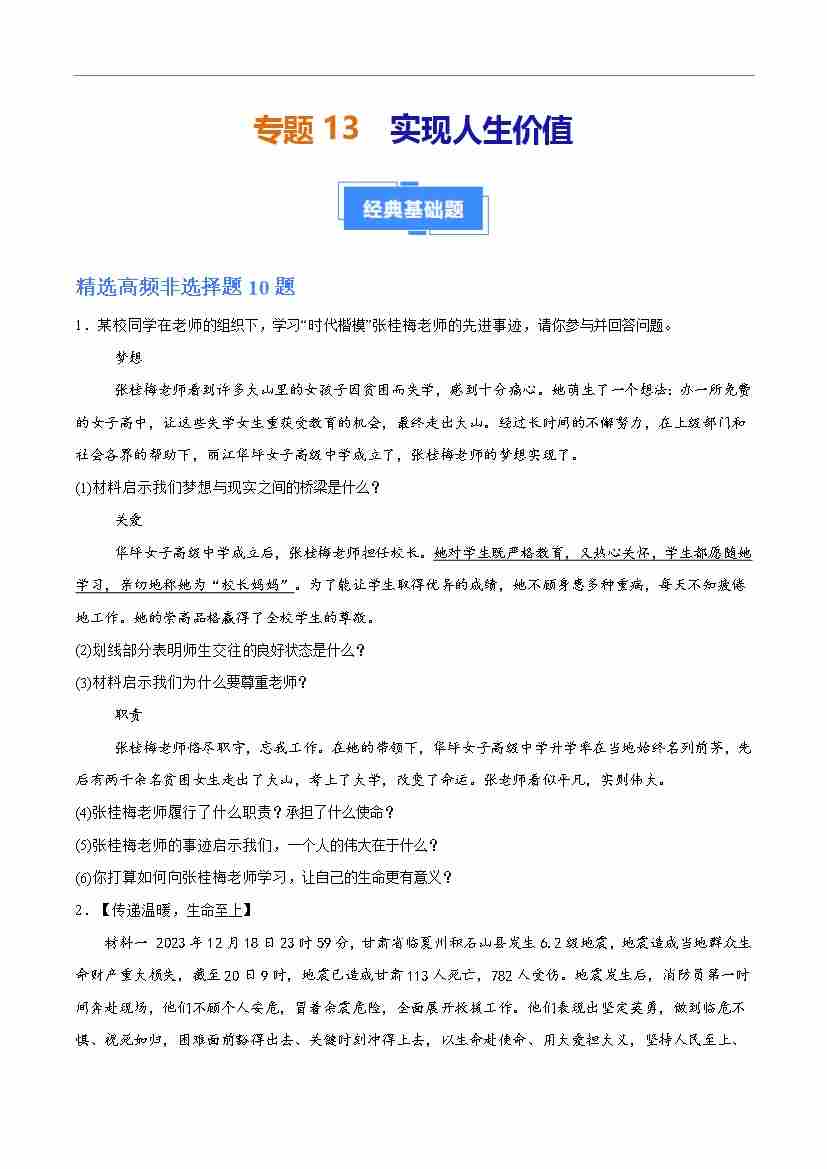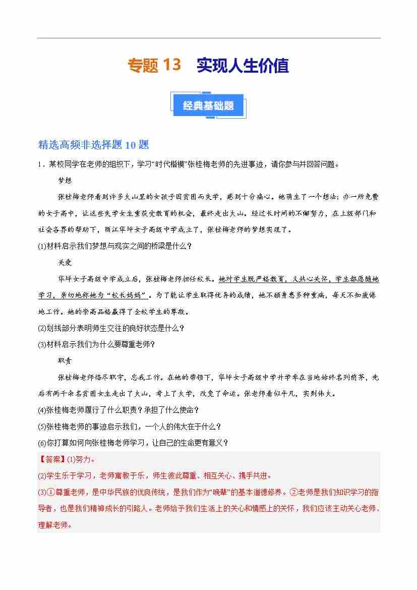 专题13 实现人生价值(高频非选择题20题)(学生版)