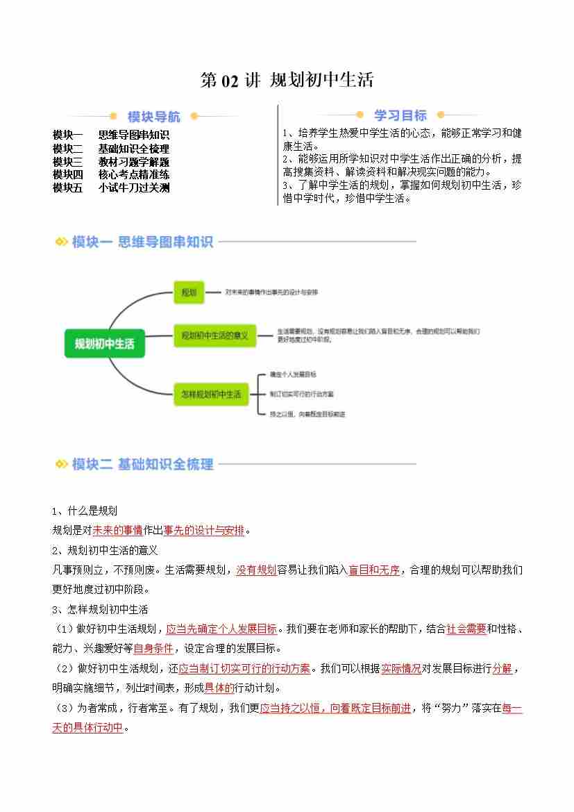 第02讲 规划初中生活-【暑假自学课】2024年新七年级道德与法治暑假提升精品讲义(统编版)