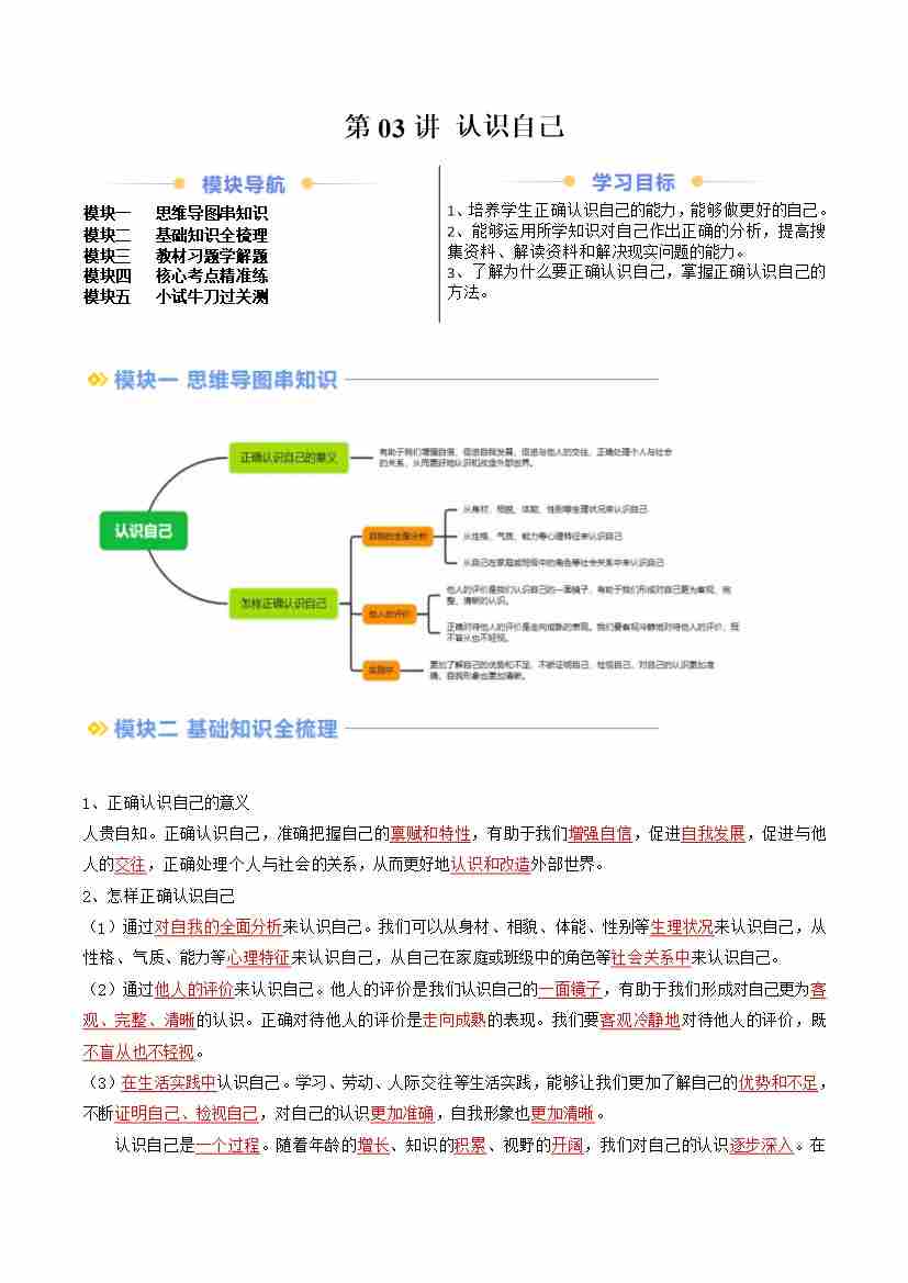 第03讲 认识自己-【暑假自学课】2024年新七年级道德与法治暑假提升精品讲义(统编版)