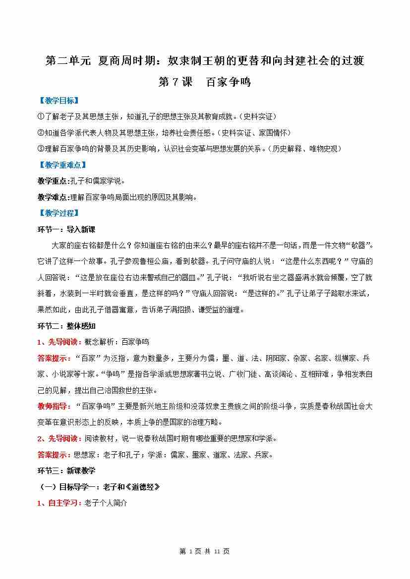 第7课 百家争鸣(教学设计)