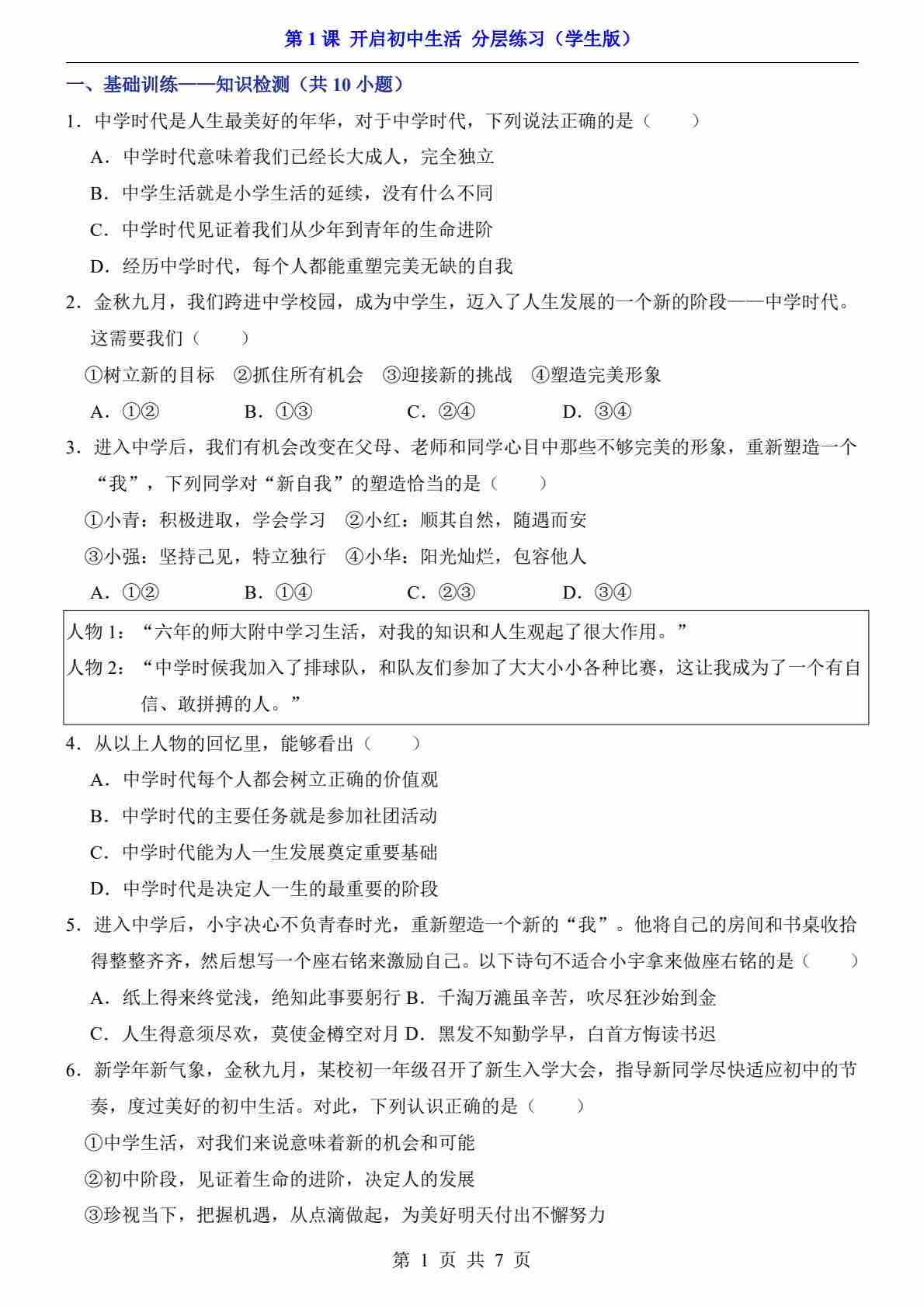 第1课 开启初中生活(分层练习)