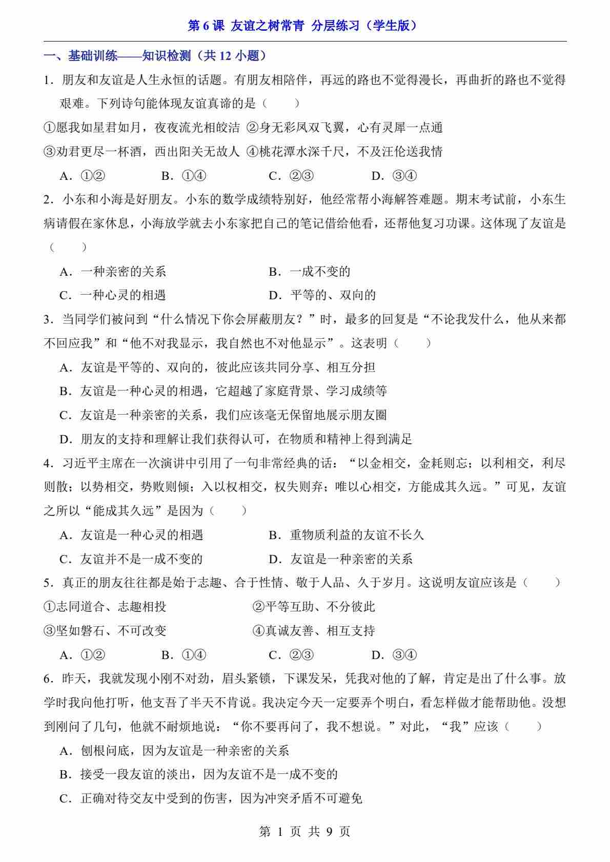 第6课 友谊之树常青(分层练习)